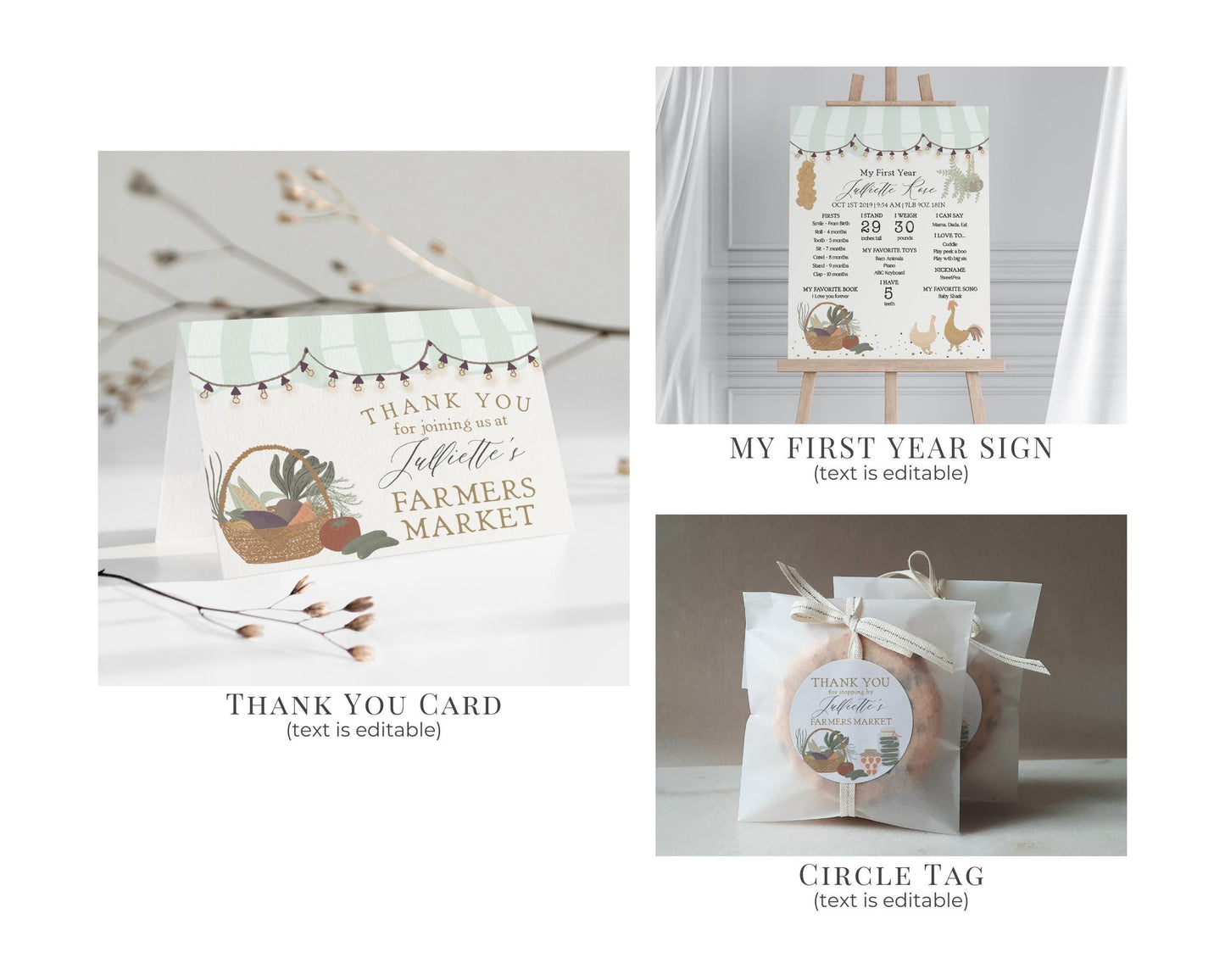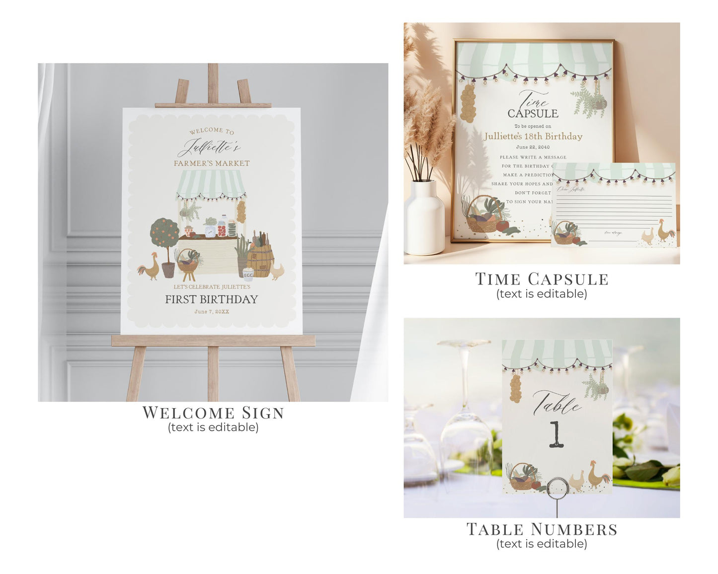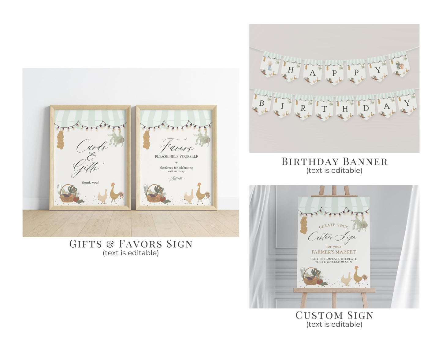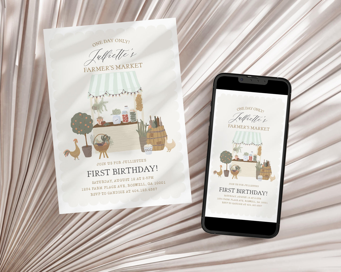 It's a One Day Only, Farmers Market Birthday. Elevate your event with the authentic charm of an outing at your local Farmers Market. This collection features an adorable green farmers market stand accented with market-fresh treasures. A party brimming with farm-fresh delights and the spirit of community.