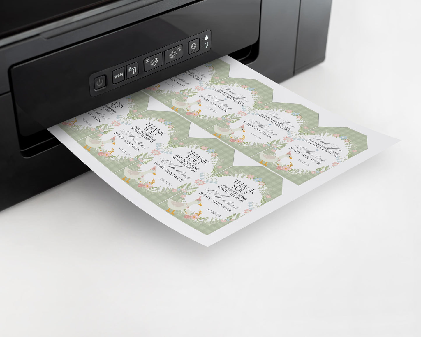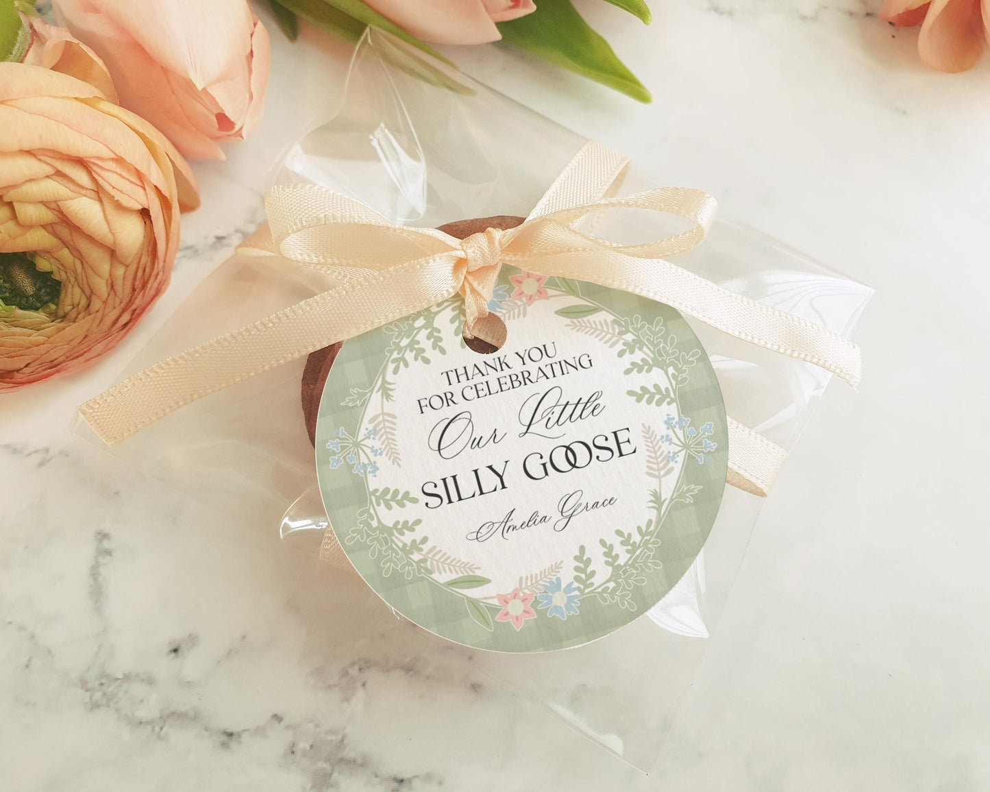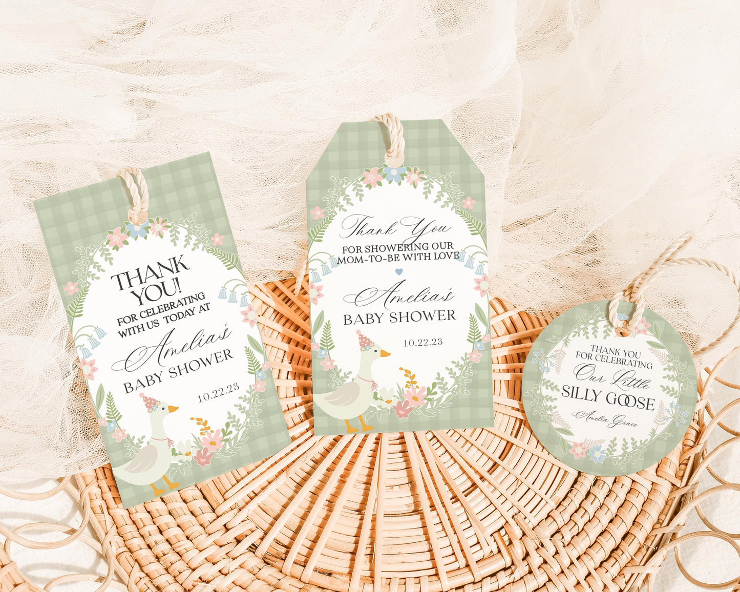 Green Floral Silly Goose Baby Shower Favor Tags Printable Template, Little Duck Theme Shower Girl, Pastel Sage Gingham Baby Sprinkle WP1024