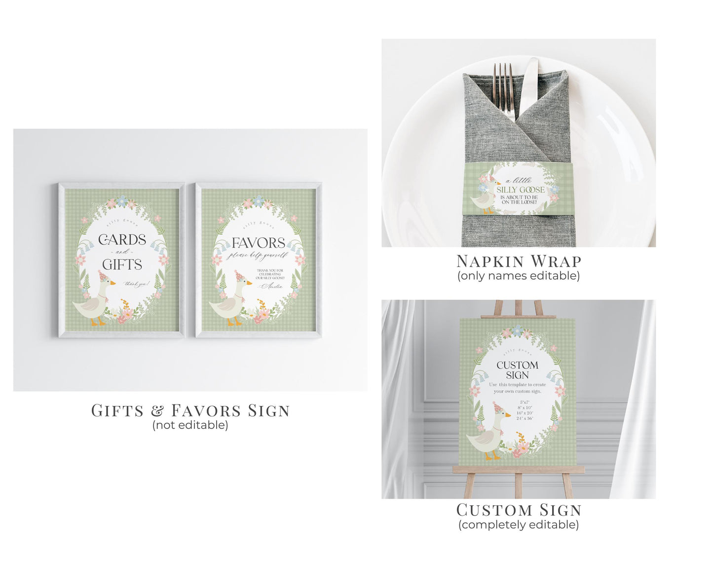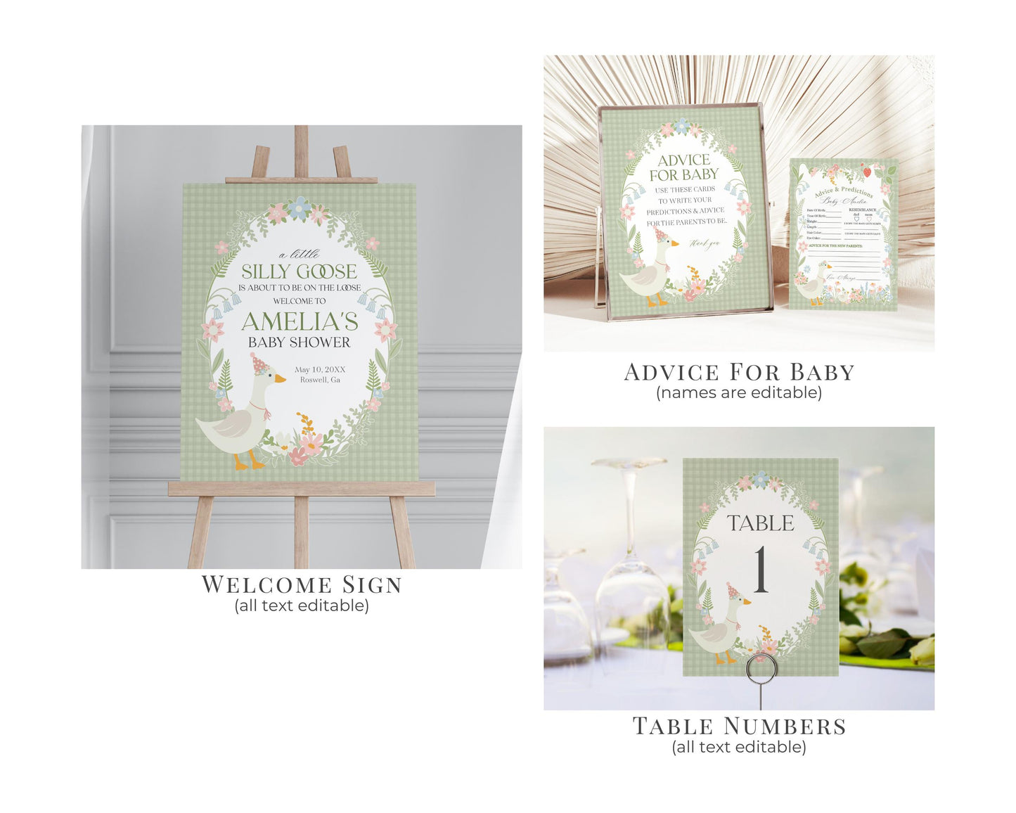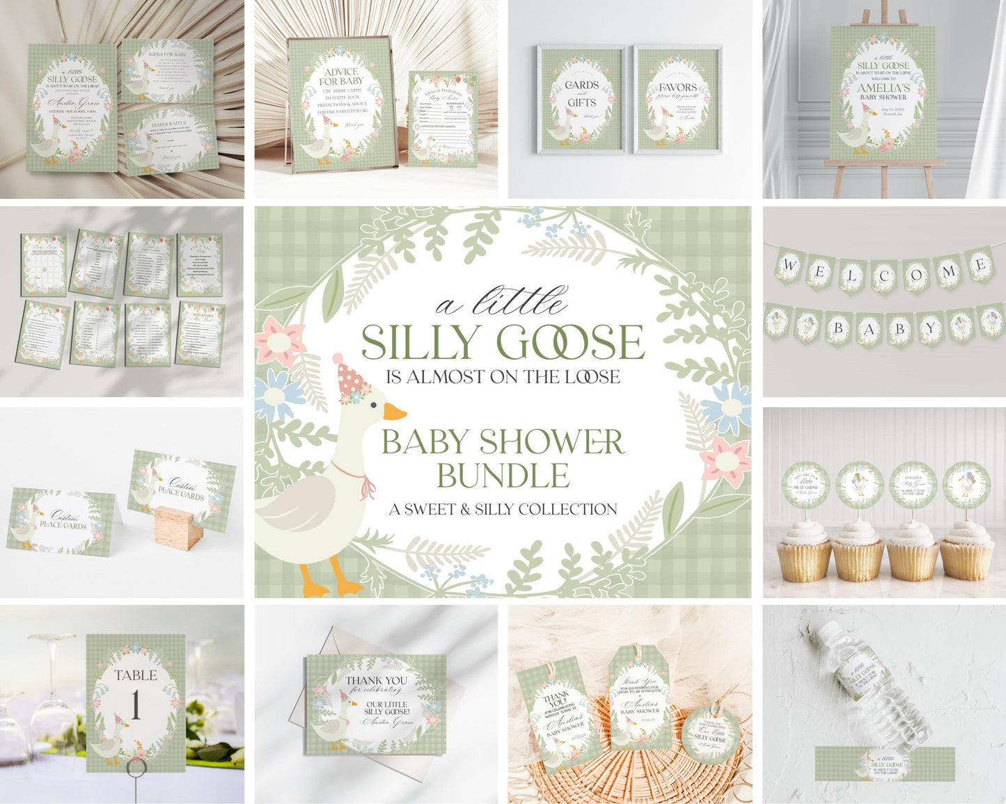 Green Floral Silly Goose Baby Shower Bundle Printable Template