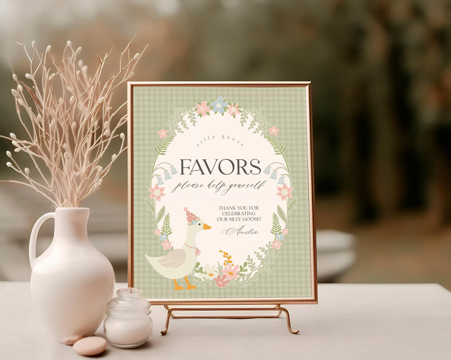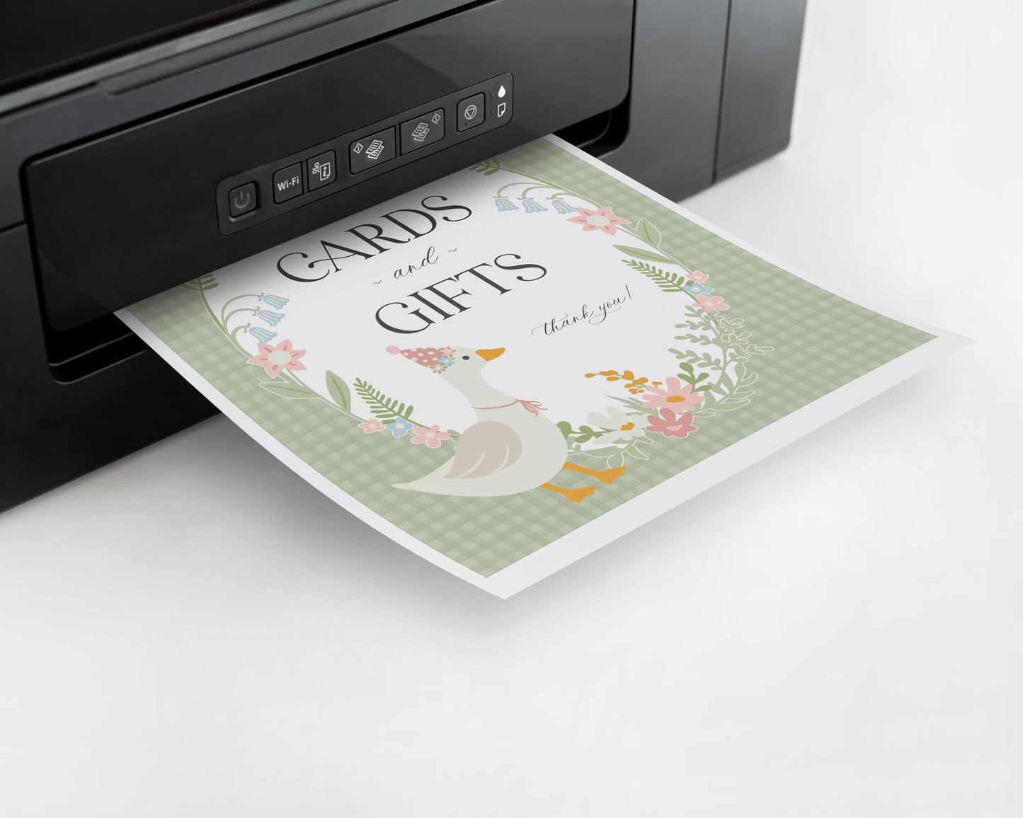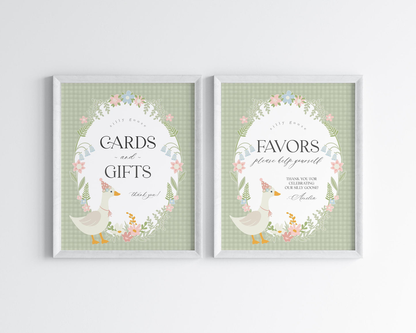 Green Floral Silly Goose Cards & Gifts and Favors Sign Printable Template, Little Duck Girl Birthday, Pastel Gingham Baby Sprinkle WP1024