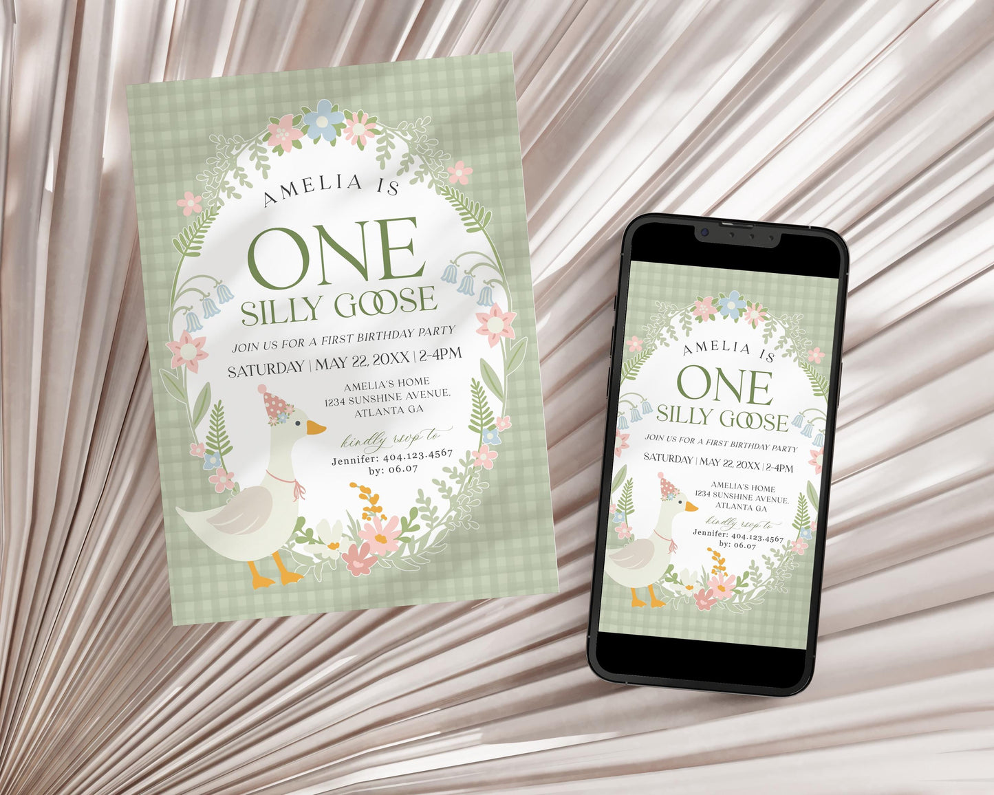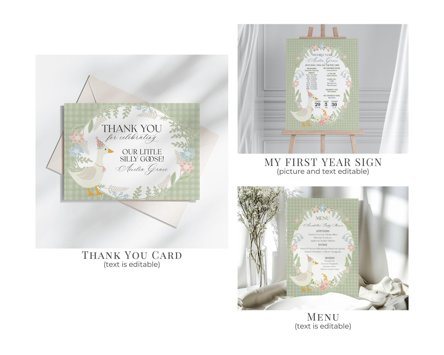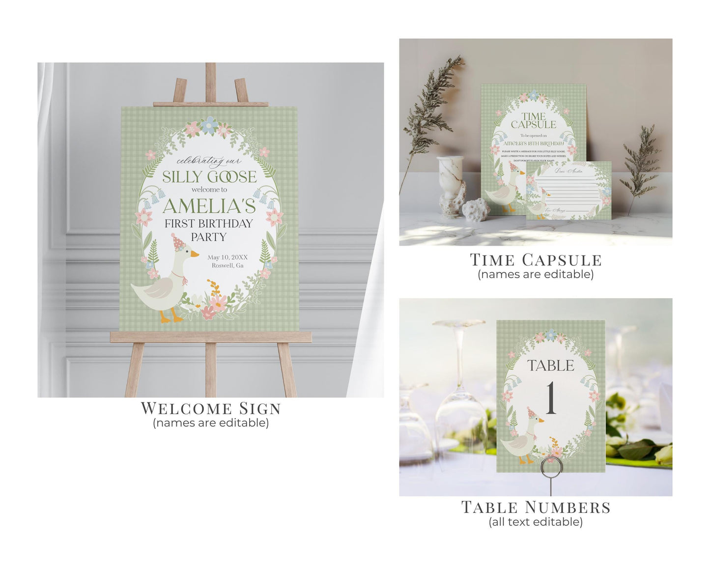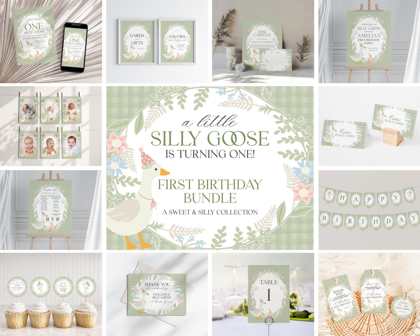 Green Floral Silly Goose First Birthday Bundle Printable Template