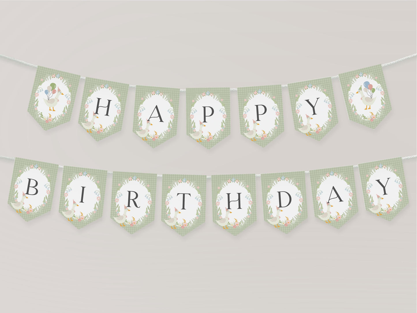 Green Floral Silly Goose Happy Birthday Banner Printable Template, Little Duck Theme Birthday Girl, Pastel Gingham Birthday Party WP1024