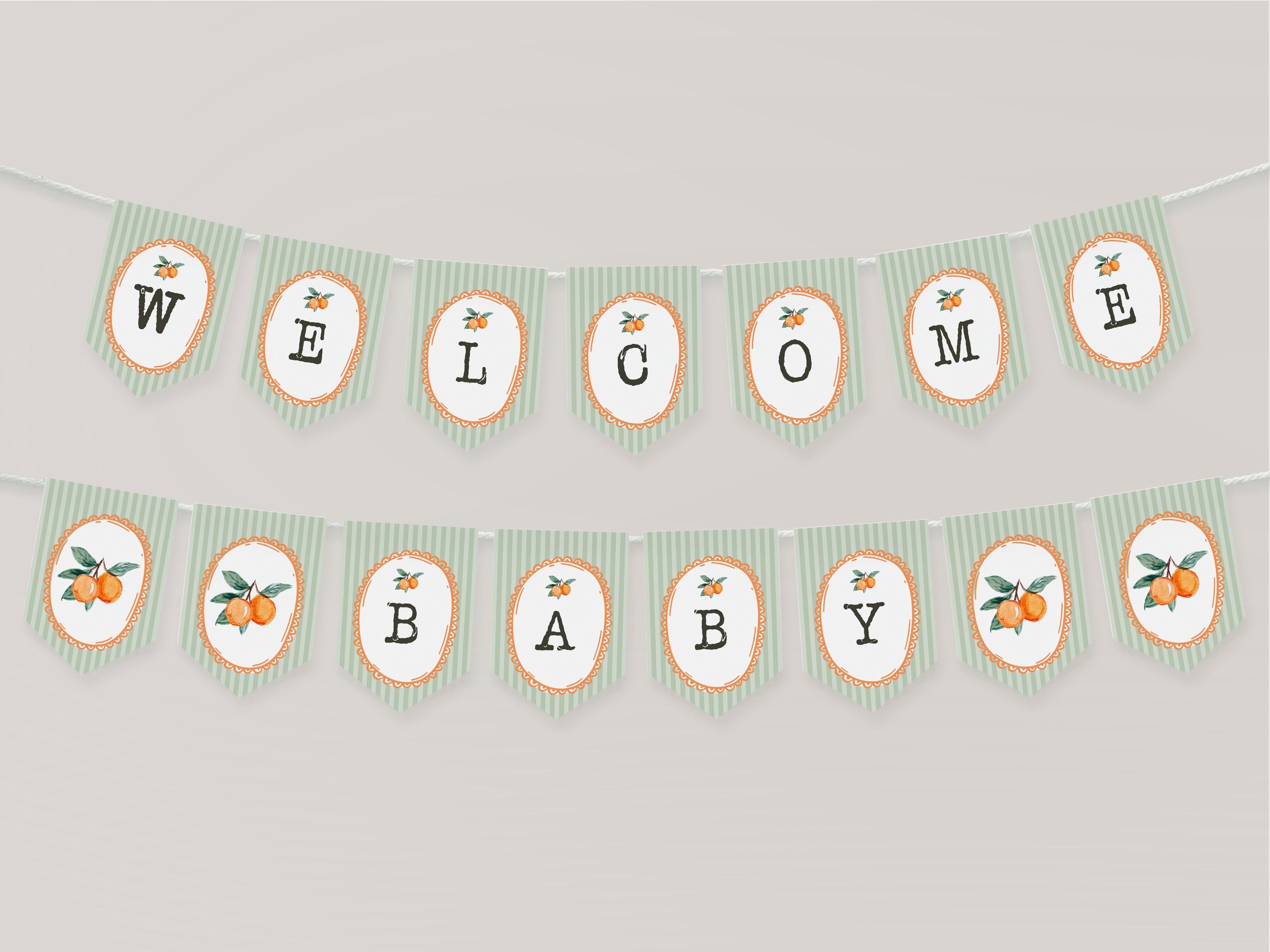 Green Little Cutie Baby Shower Banner Template, Pastel Citrus Baby Sprinkle for Summer Baby Shower, Retro Clementine Shower Decor WP1051
