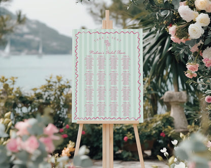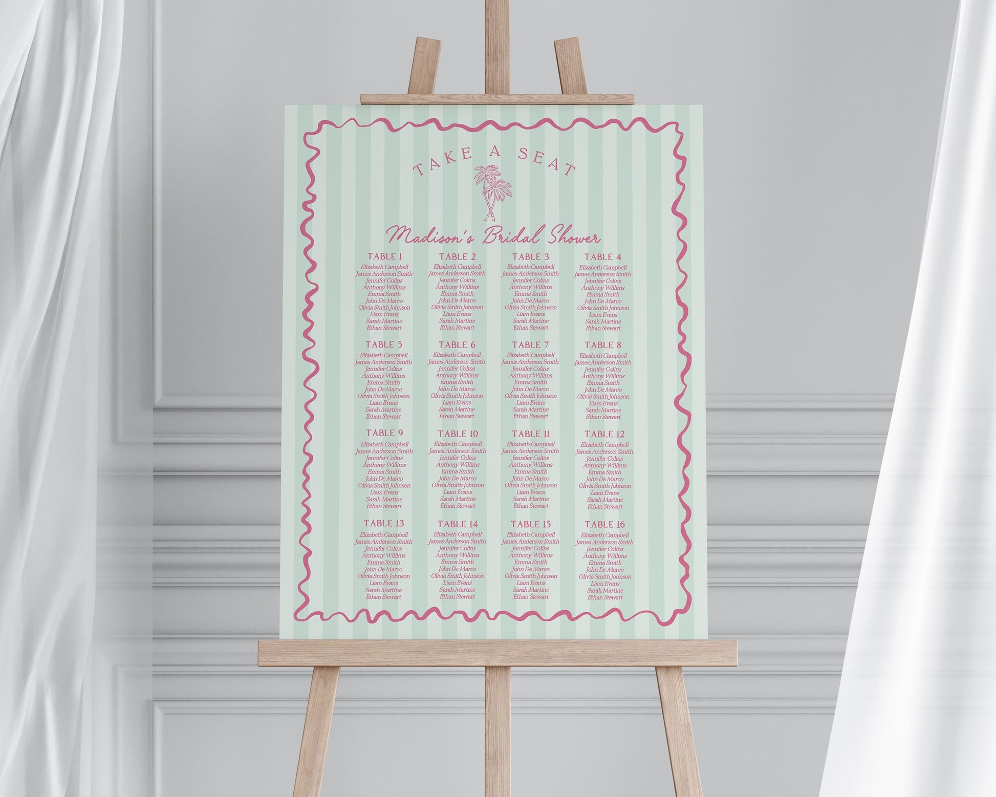 Green Palm Springs Seating Chart Poster Template, Vintage Palm Tree Beach Cabana Birthday Pool Party, Tropical Pastel Bachelorette WP1047