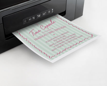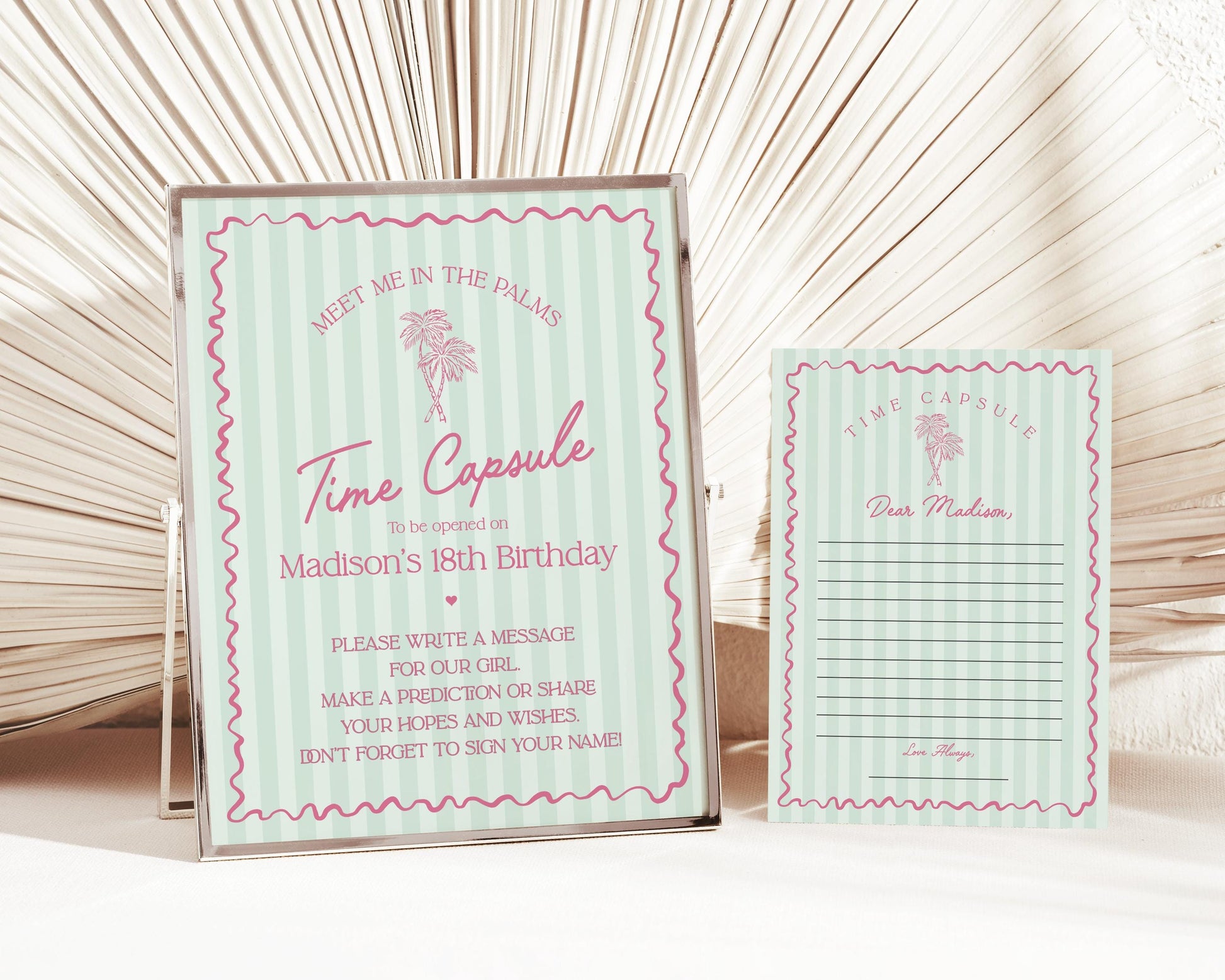 Green Palm Springs Time Capsule Template, Vintage Palm Tree Beach Cabana First Birthday Pool Party, Retro Tropical Pastel Party WP1047
