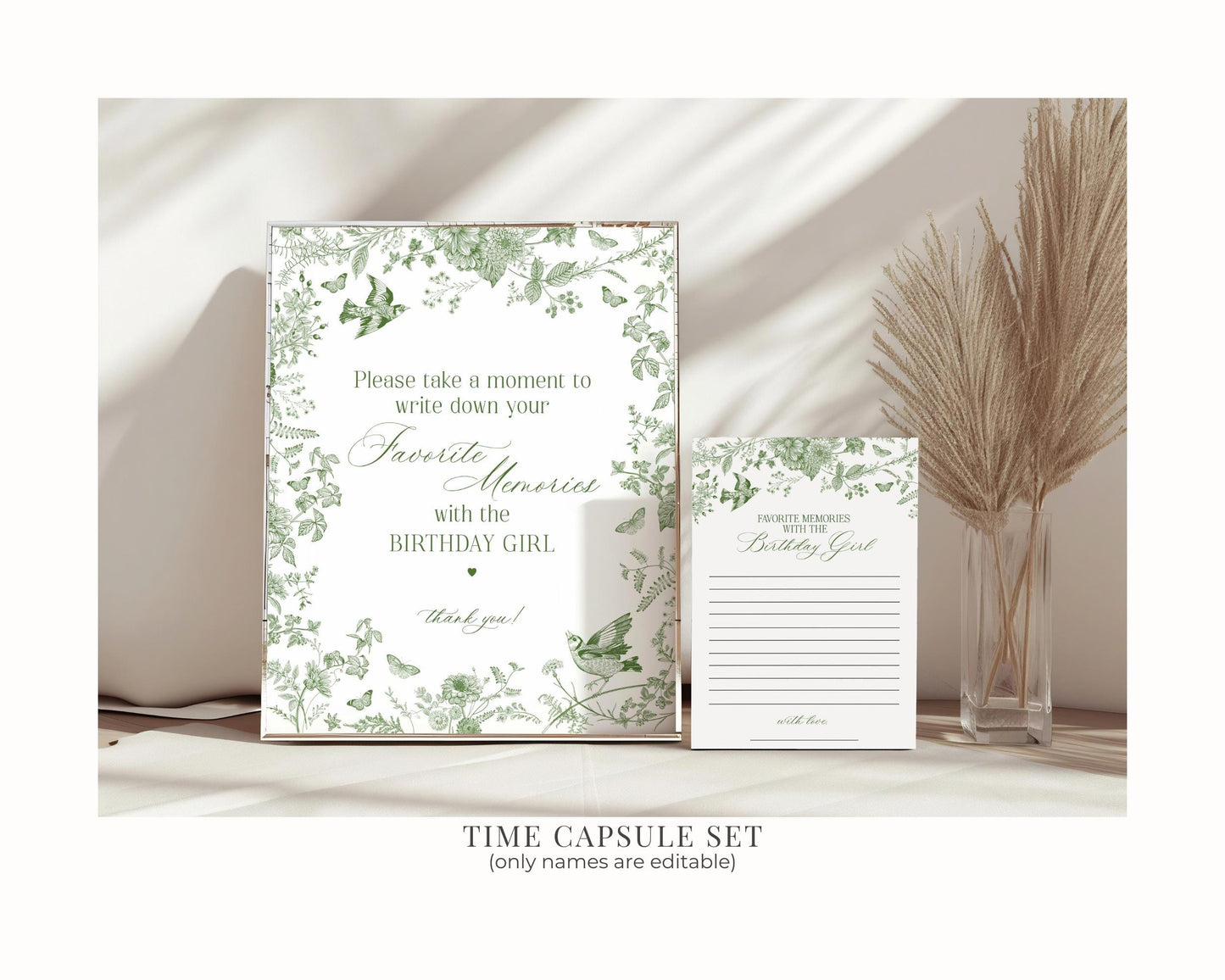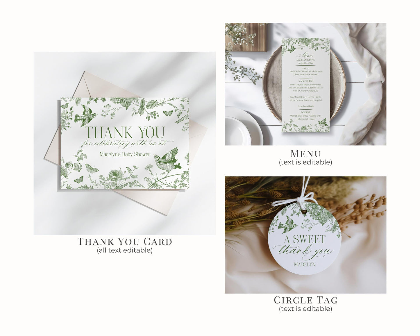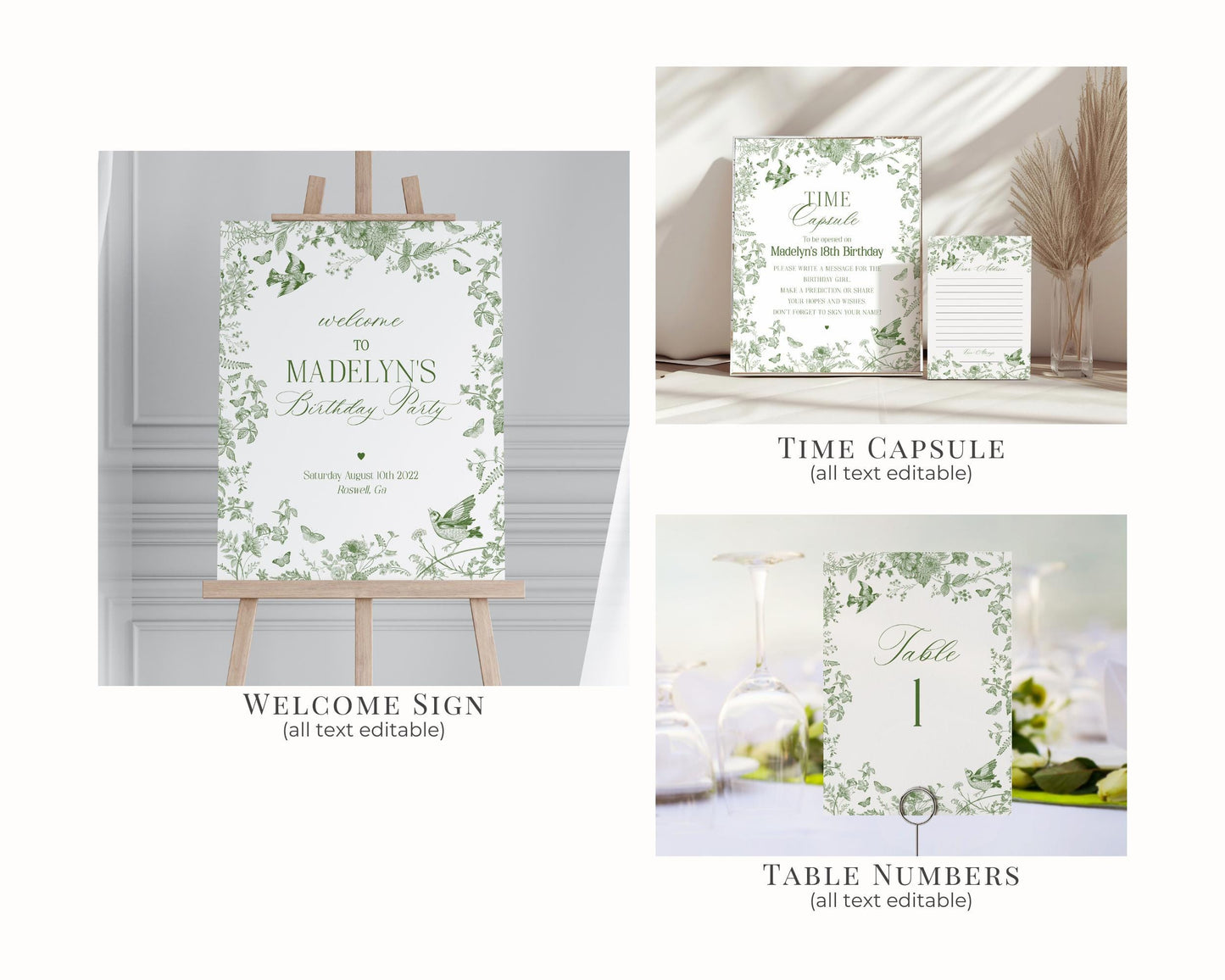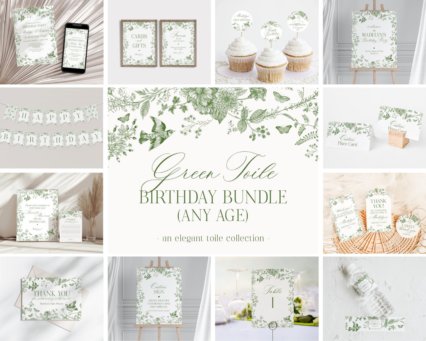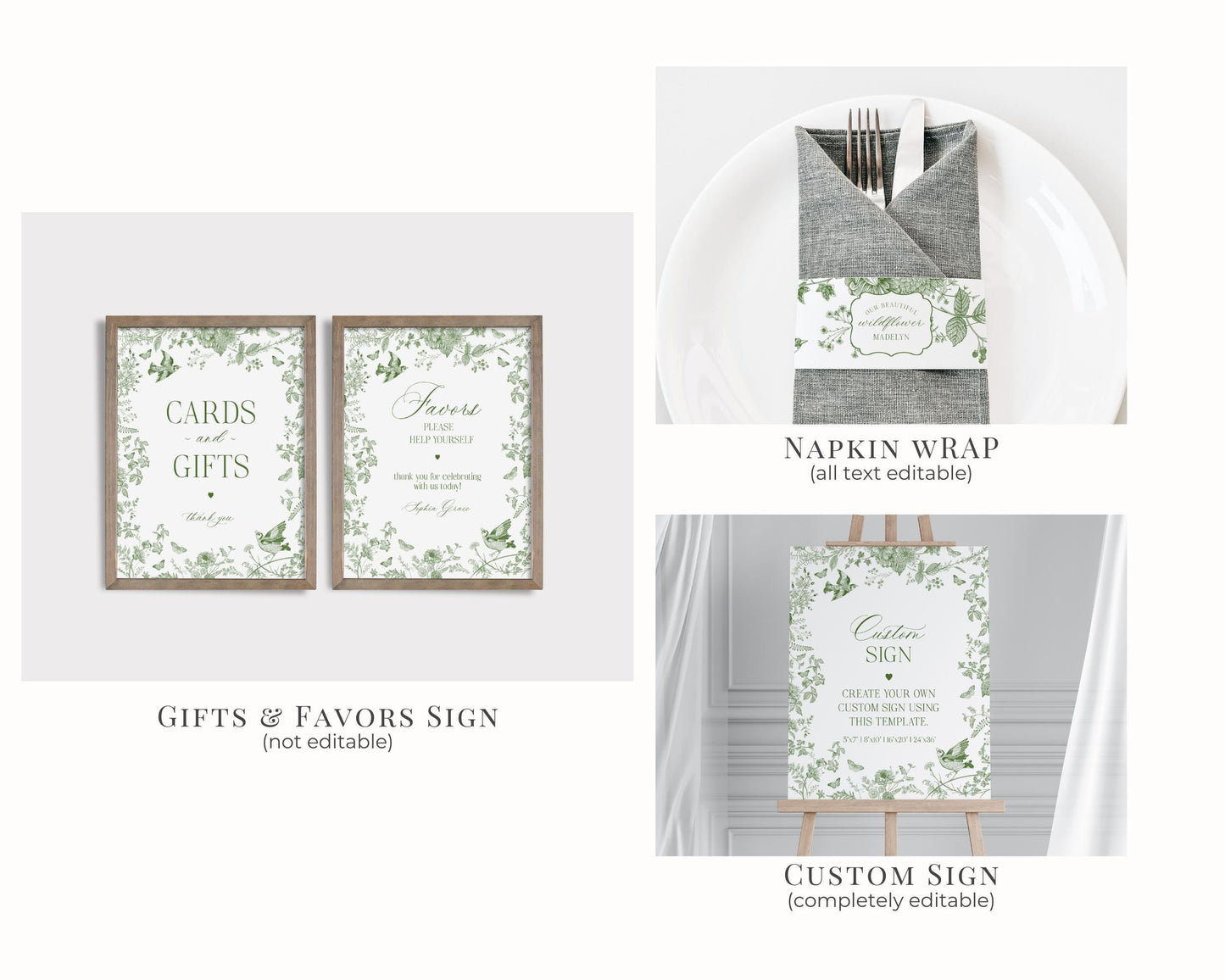 Transform your celebration with our Olive Green Toile de Jouy Party Decor Collection. This elegant ensemble showcases intricate chinoiserie wildflowers, birds, and butterflies, all meticulously designed to create a sophisticated and timeless atmosphere. With detailed florals and a rich olive green palette, this collection adds a touch of refined beauty to any event. Perfect for those seeking an elegant and nature-inspired theme, it effortlessly brings classic charm to your special day.