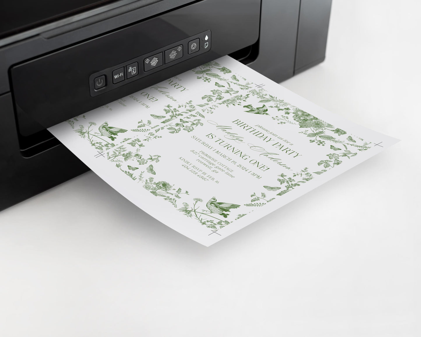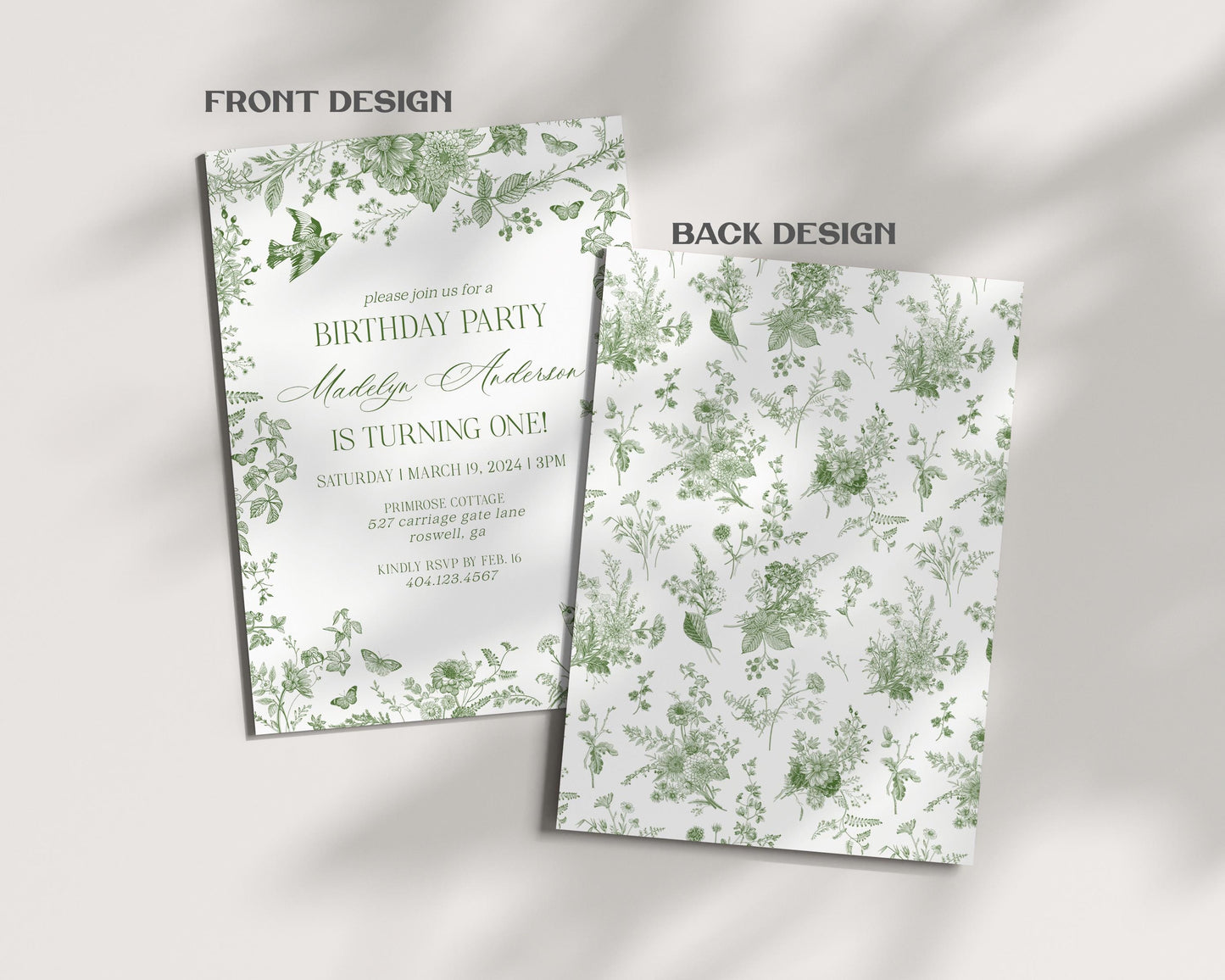 Green Toile De Jouy Birthday Invitation Printable Template, Olive Chinoiserie Birthday Party Decor Wildflower Toile Butterflies Birds WP1007