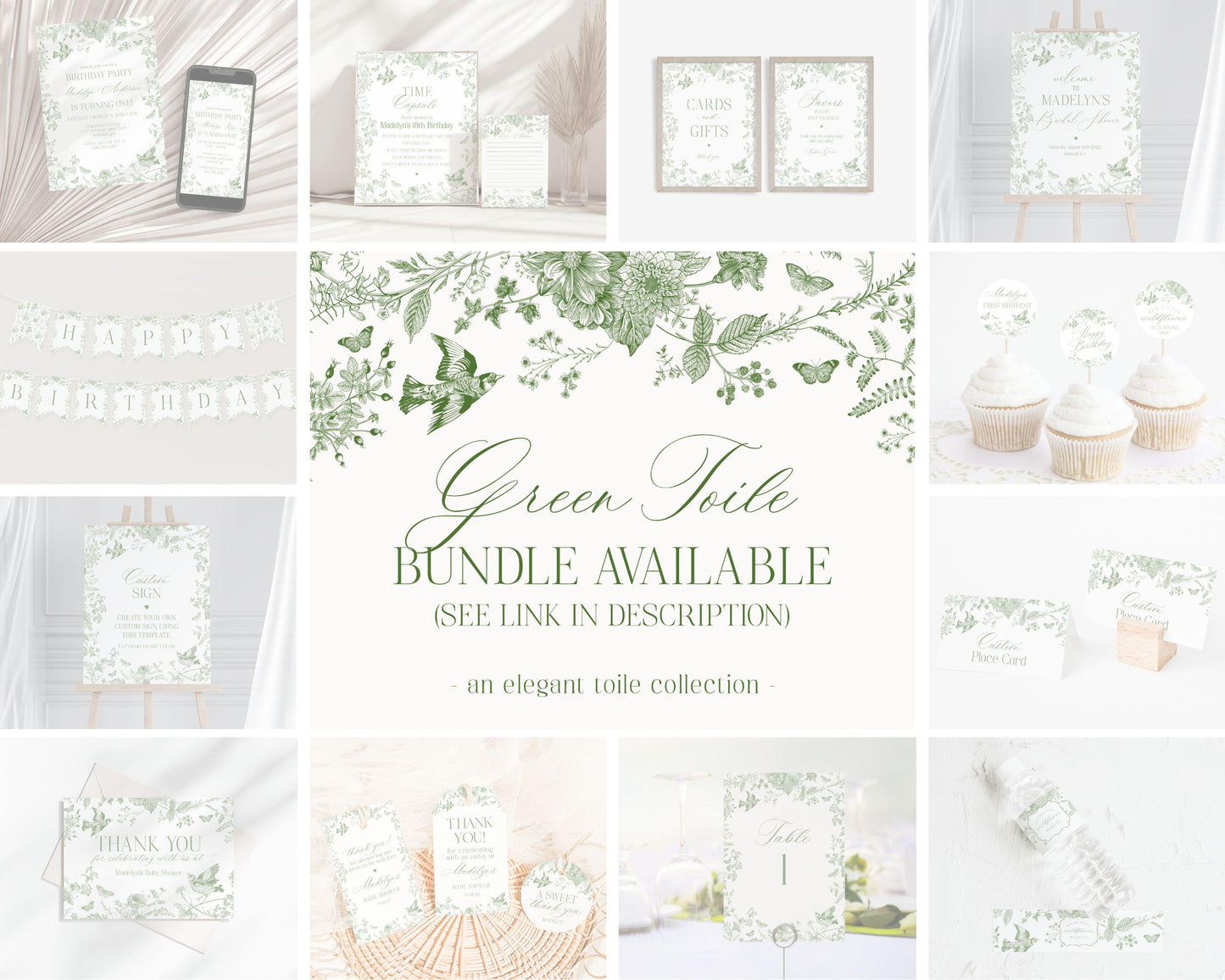 Green Toile De Jouy Birthday Bundle Printable Template, Olive Chinoiserie Birthday Party Decor, Wildflower Toile Butterflies Birds WP1007