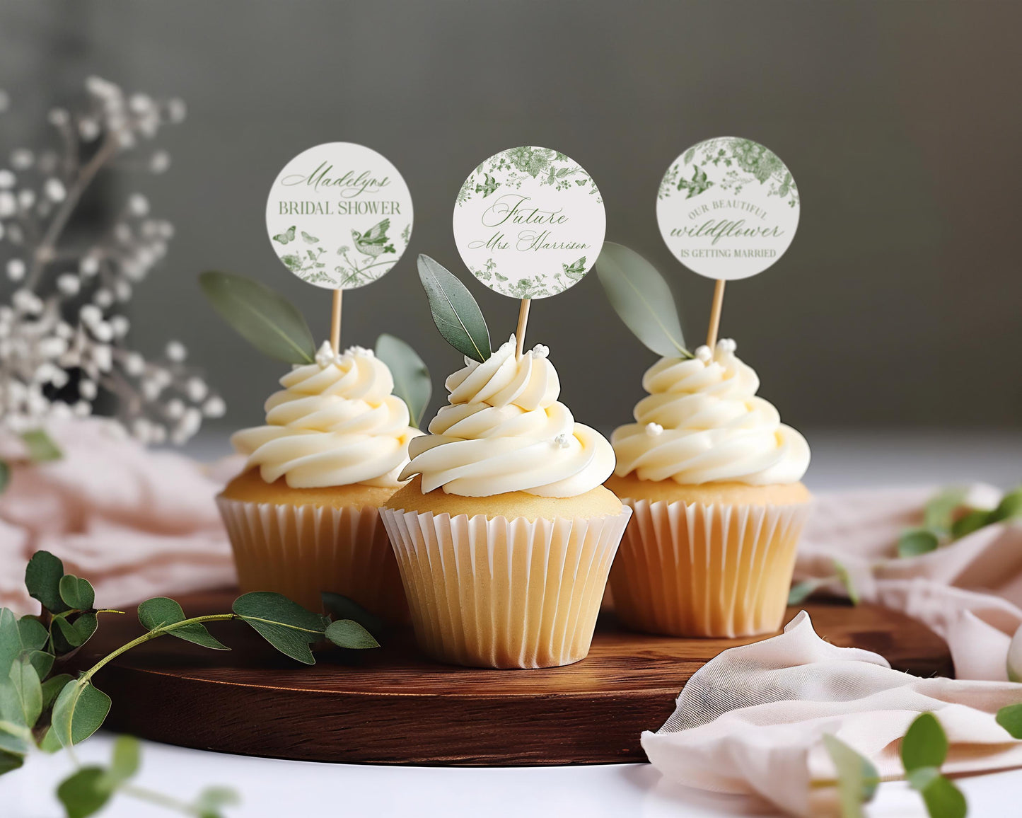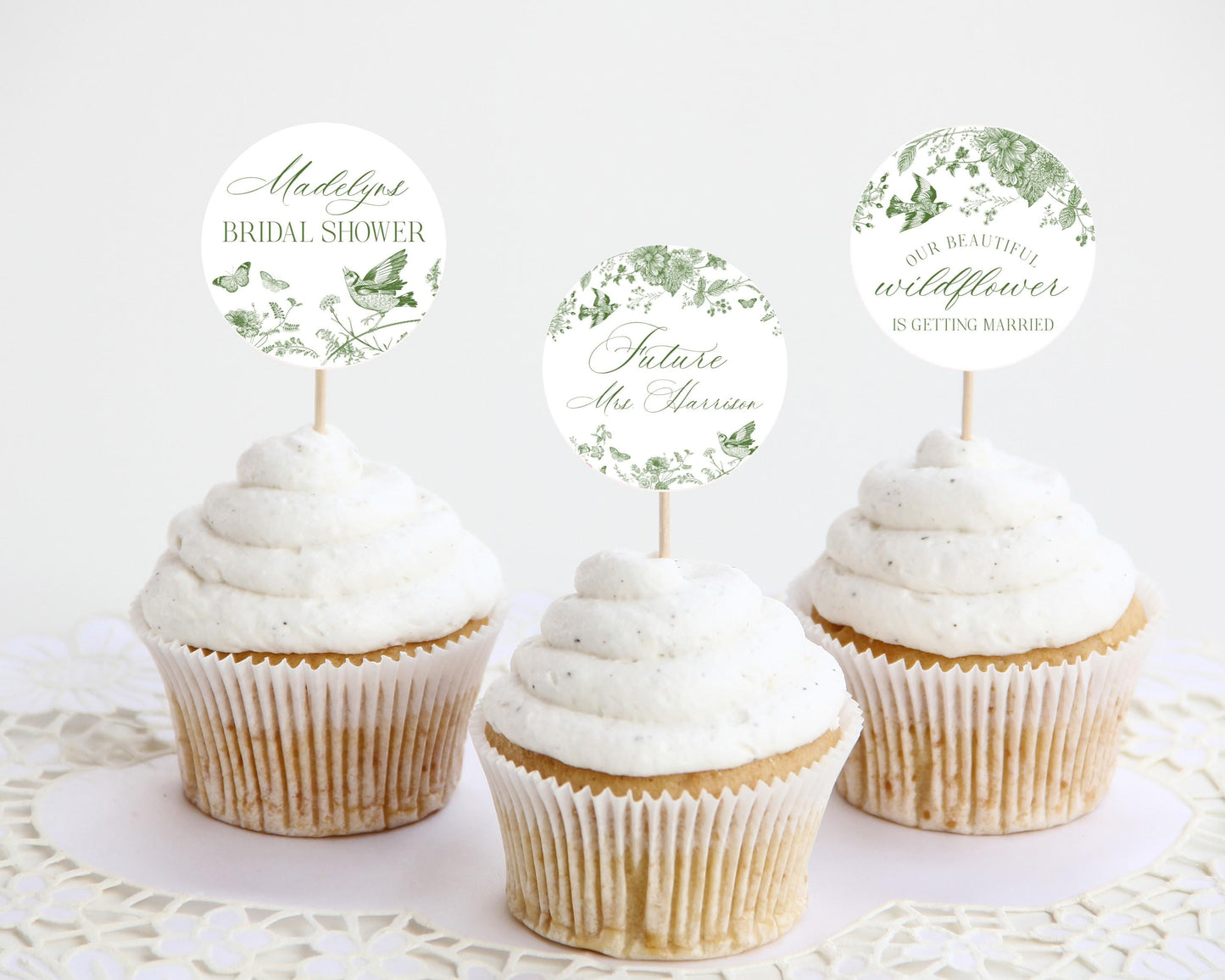 Green Toile De Jouy Bridal Shower Cupcake Topper Template, Olive Chinoiserie French Theme Wedding Sage Wildflower Bridal Brunch WP1007