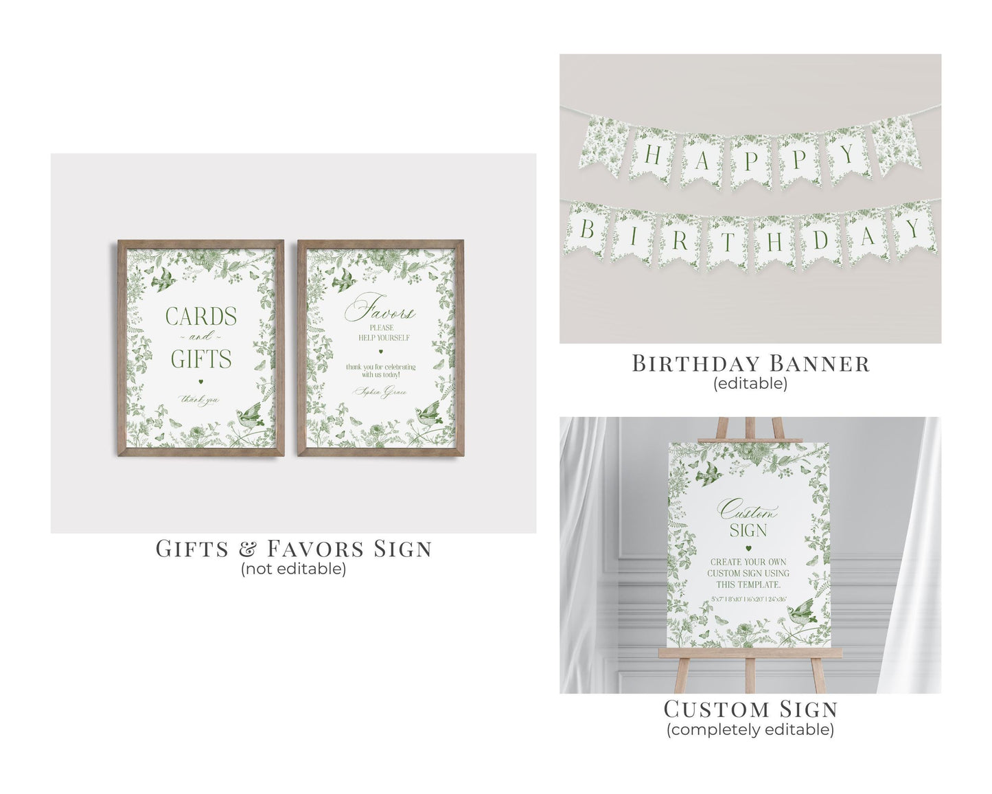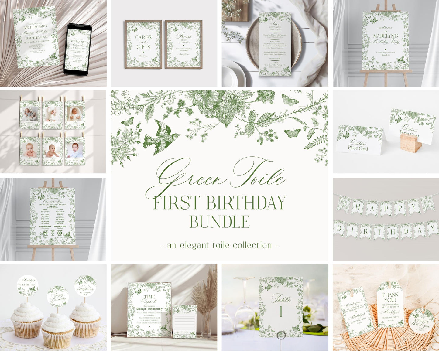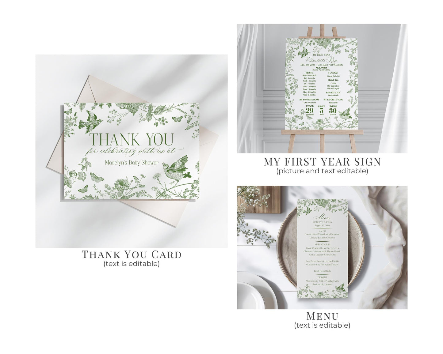 Transform your celebration with our Olive Green Toile de Jouy Party Decor Collection. This elegant ensemble showcases intricate chinoiserie wildflowers, birds, and butterflies, all meticulously designed to create a sophisticated and timeless atmosphere. With detailed florals and a rich olive green palette, this collection adds a touch of refined beauty to any event. Perfect for those seeking an elegant and nature-inspired theme, it effortlessly brings classic charm to your special day.