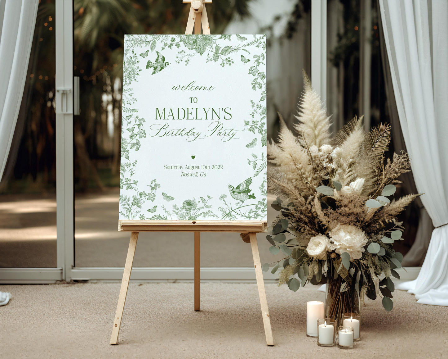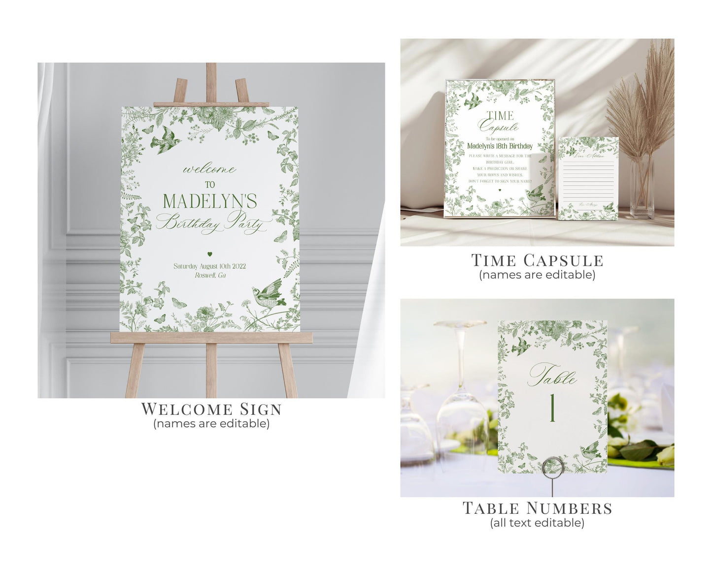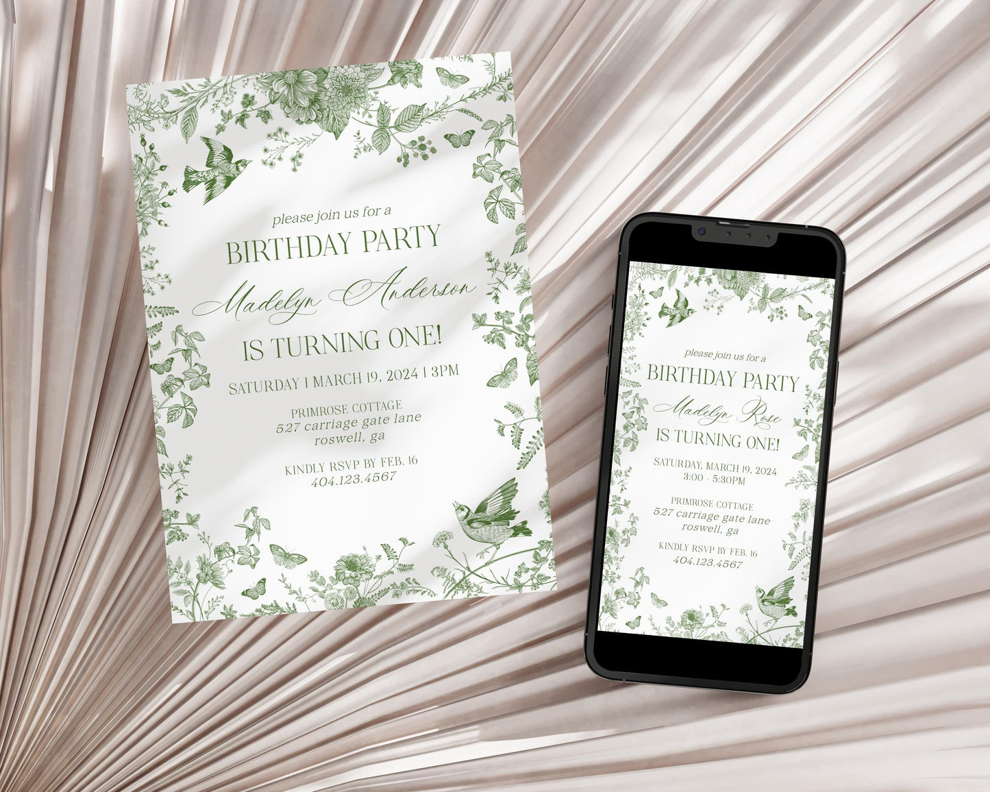 Transform your celebration with our Olive Green Toile de Jouy Party Decor Collection. This elegant ensemble showcases intricate chinoiserie wildflowers, birds, and butterflies, all meticulously designed to create a sophisticated and timeless atmosphere. With detailed florals and a rich olive green palette, this collection adds a touch of refined beauty to any event. Perfect for those seeking an elegant and nature-inspired theme, it effortlessly brings classic charm to your special day.