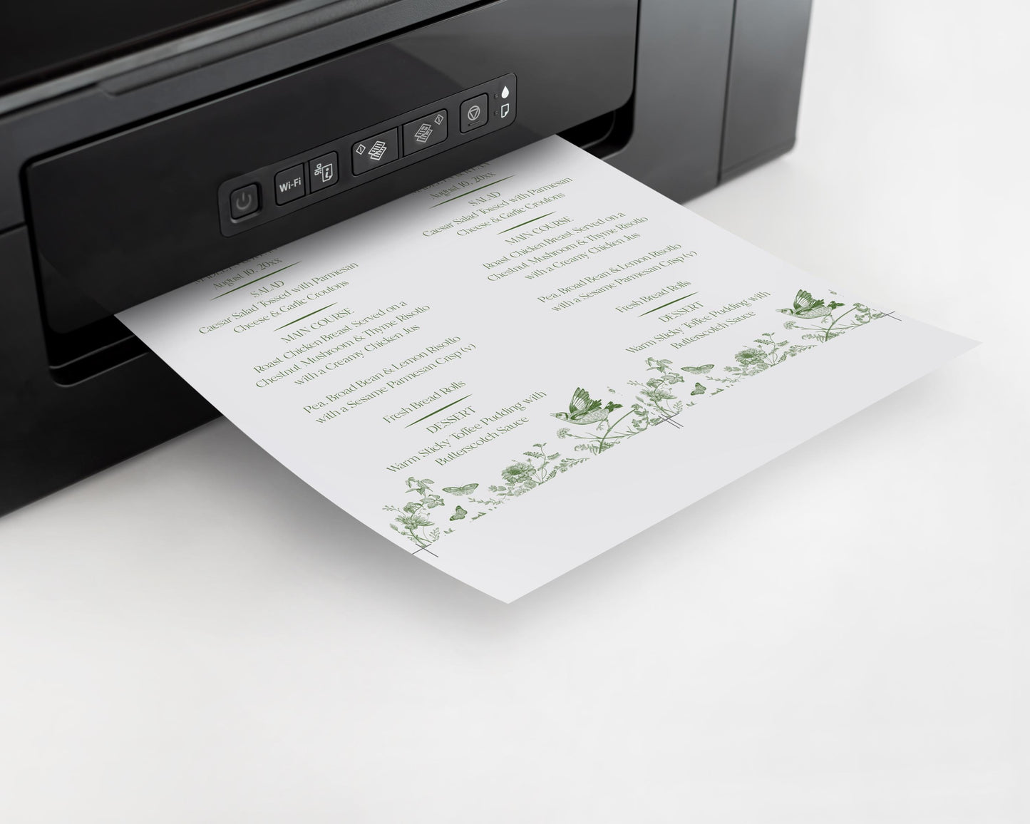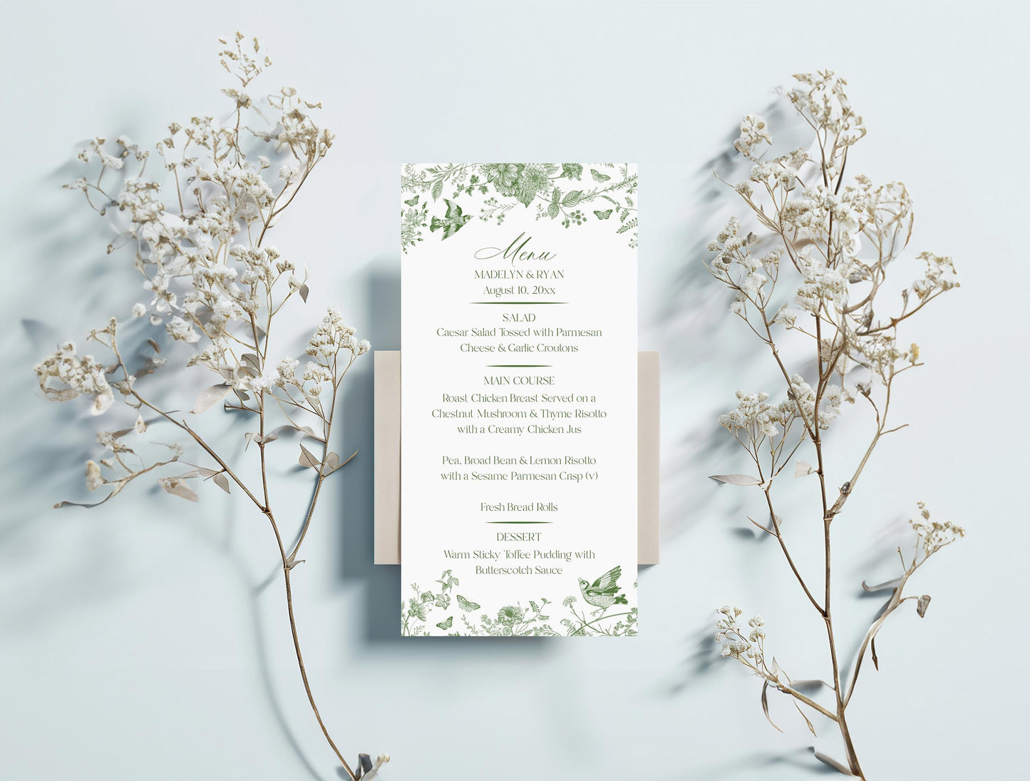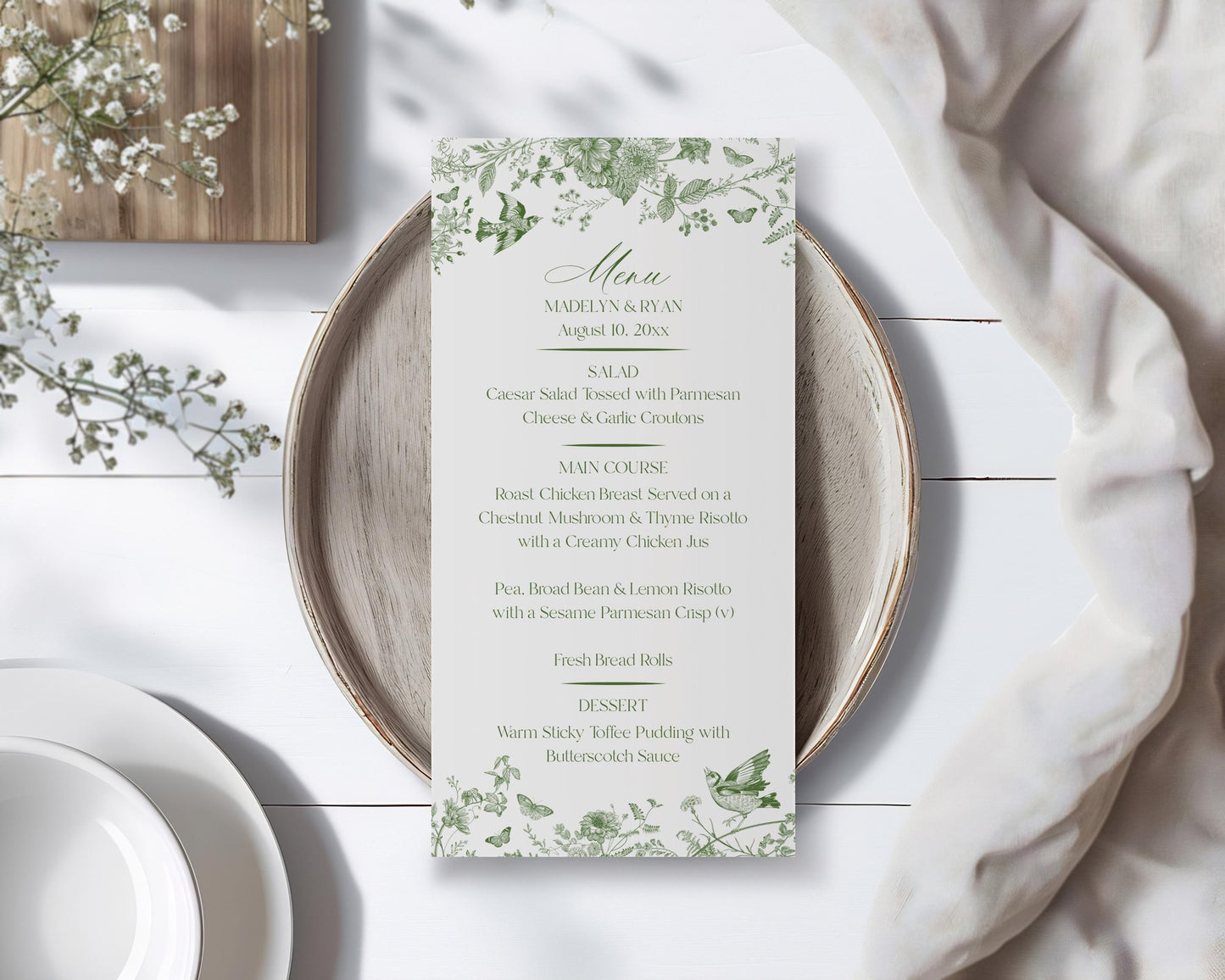 Green Toile De Jouy Printable Wedding Menu Template, Olive Chinoiserie French Theme Wedding Sage Wildflower Bridal Shower WP1007