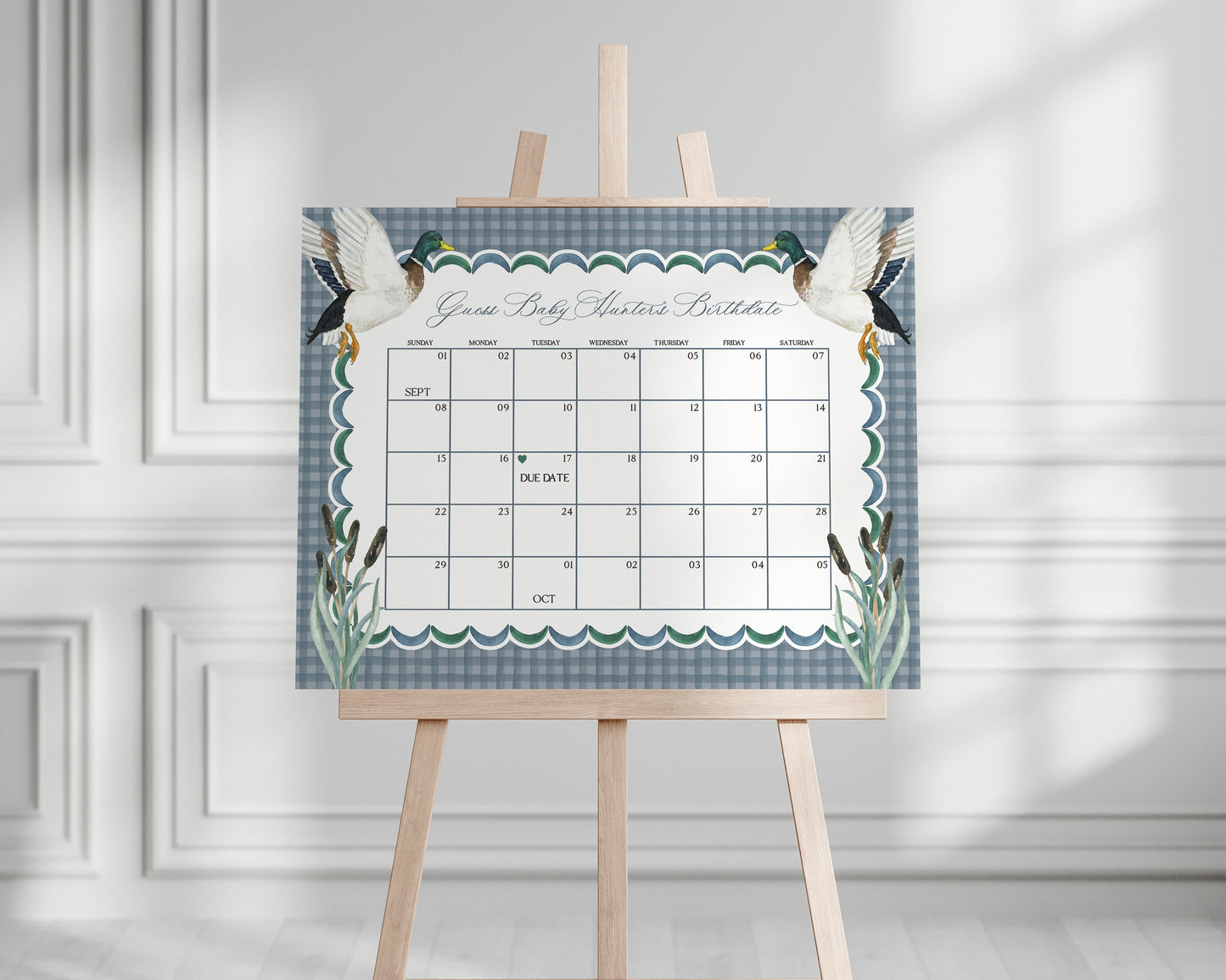Mallard Baby Shower Guess the Date Game Calendar Template, Editable Lucky Duck Baby Shower Decor for Boy, Adventure Duck Hunting Shower