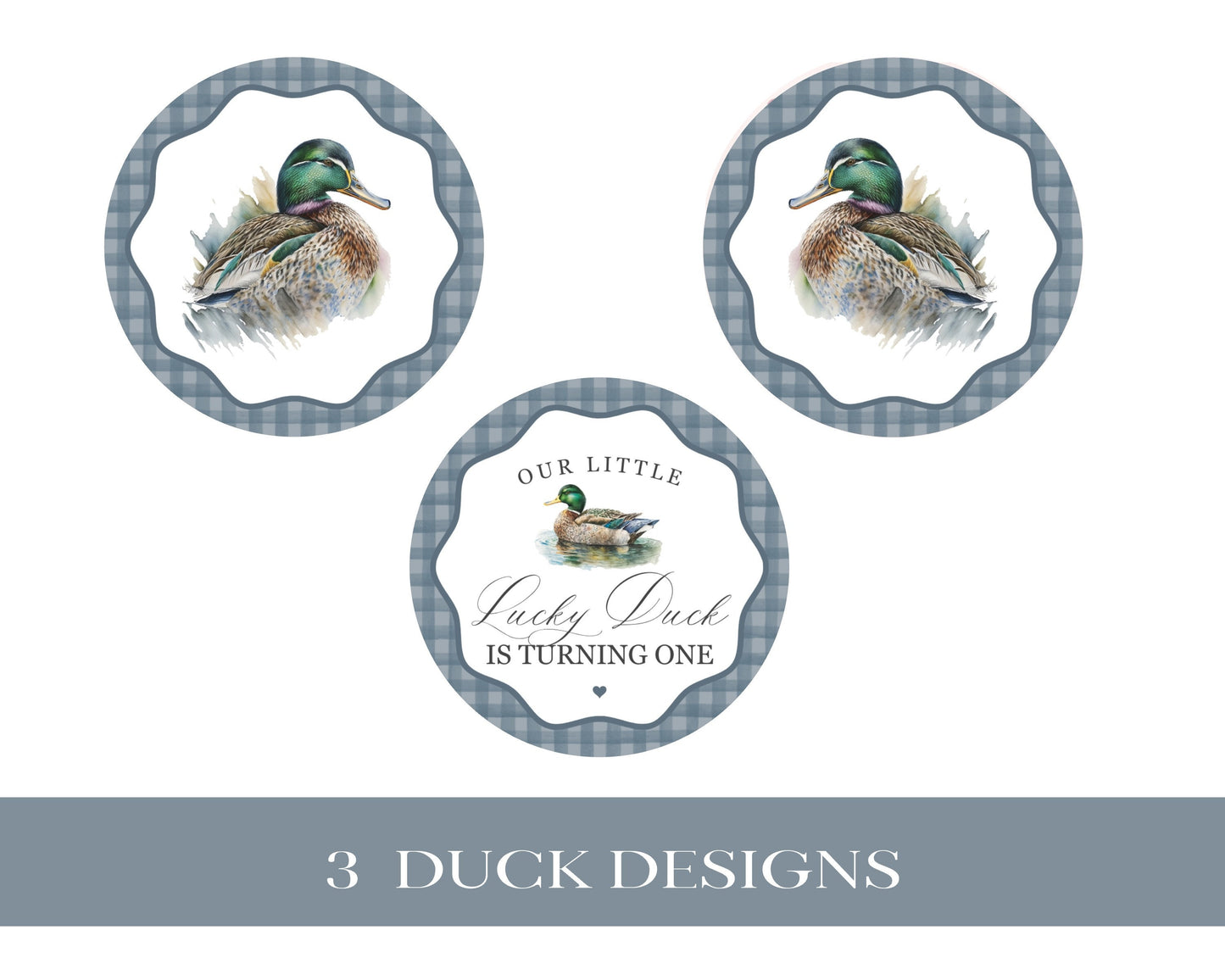 Mallard First Birthday Bundle Printable, Editable One Lucky Duck 1st Birthday Party Decor for Boy, Adventure Duck Hunting with Blue Gingham