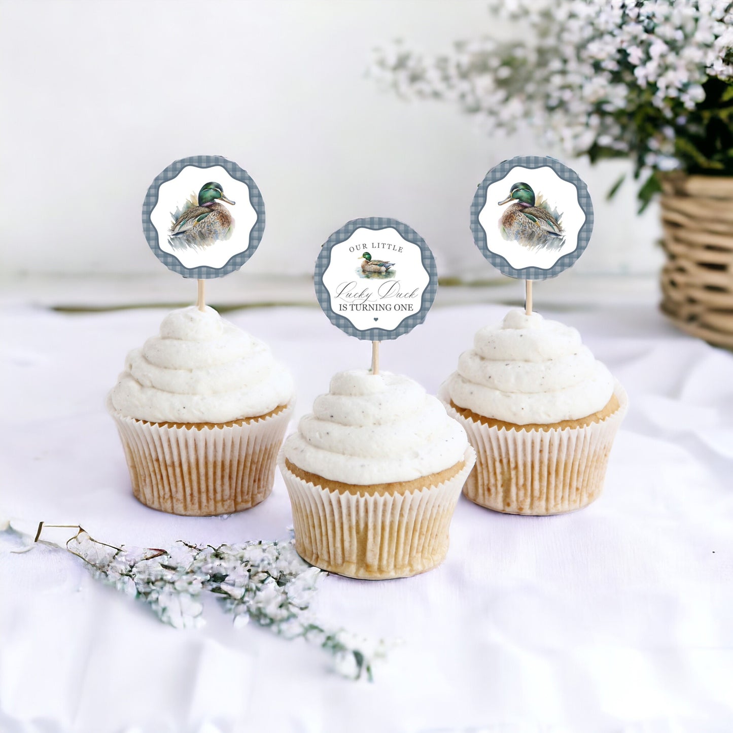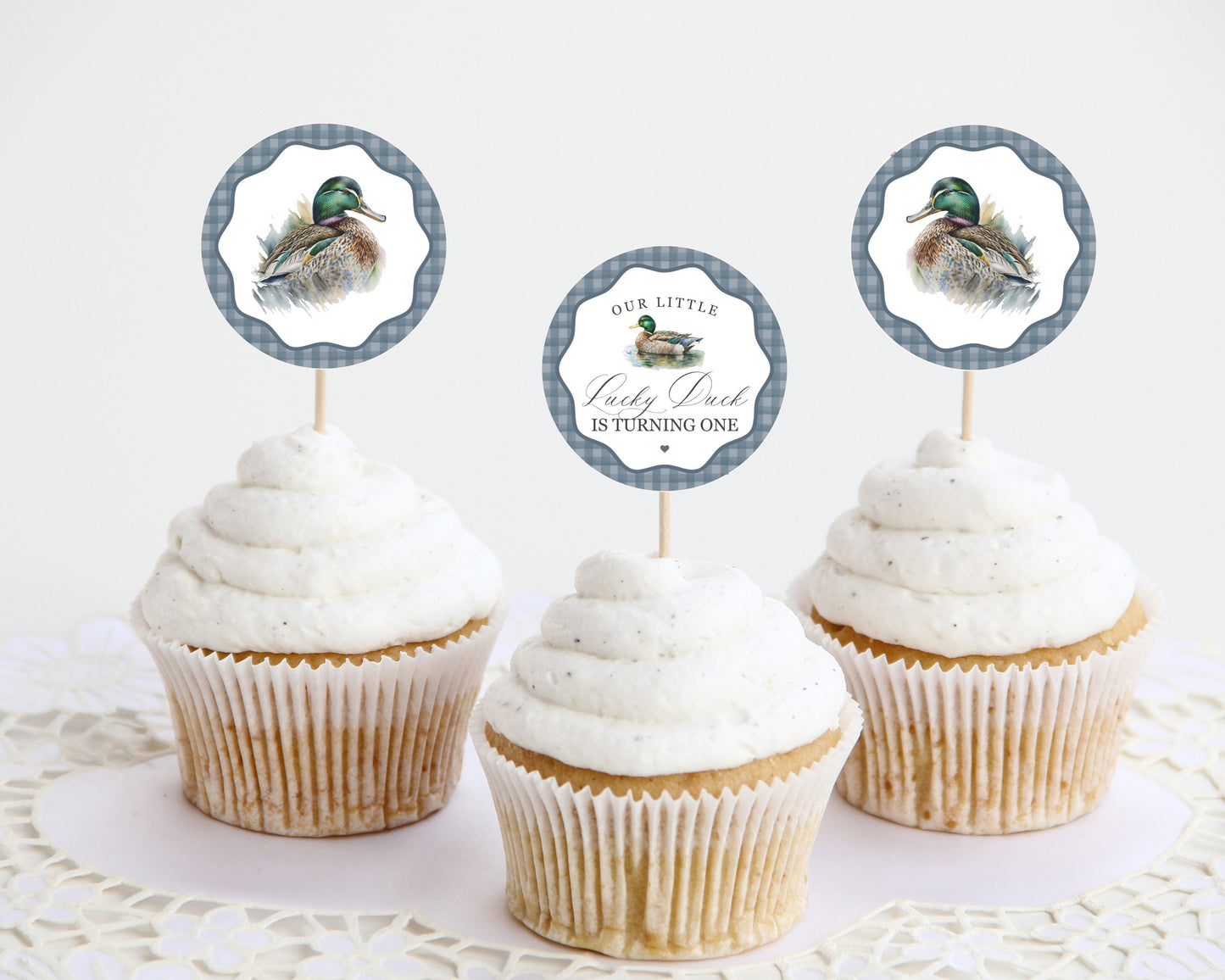 Mallard Birthday Party Cupcake Toppers Printable Template, Editable One Lucky Duck 1st Birthday Party Decor for Boy, Adventure Party Gingham