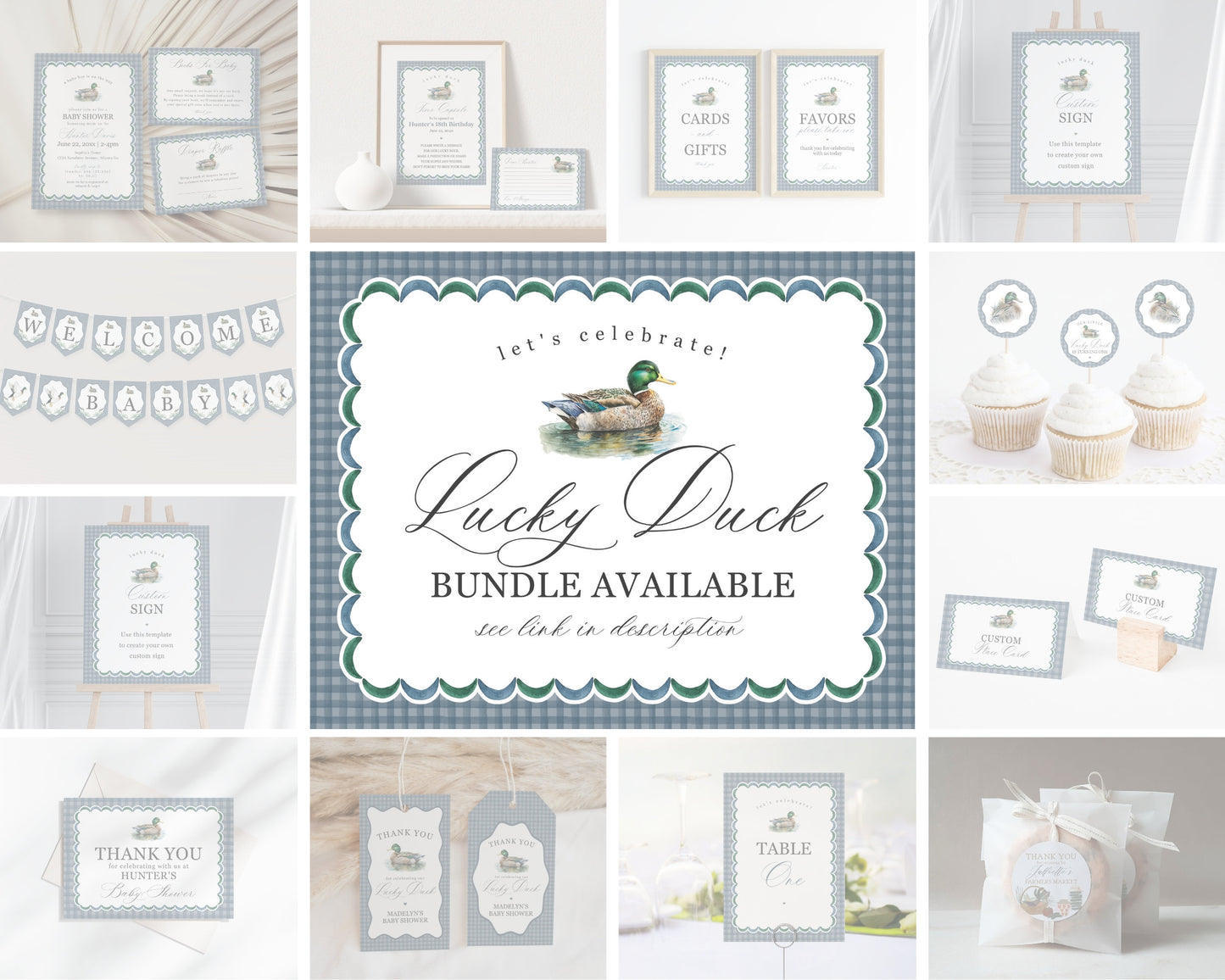 Mallard Cards & Gifts and Favors Sign Printable Template, Editable One Lucky Duck Birthday Party Decor for Boy Adventure Baby Shower Gingham