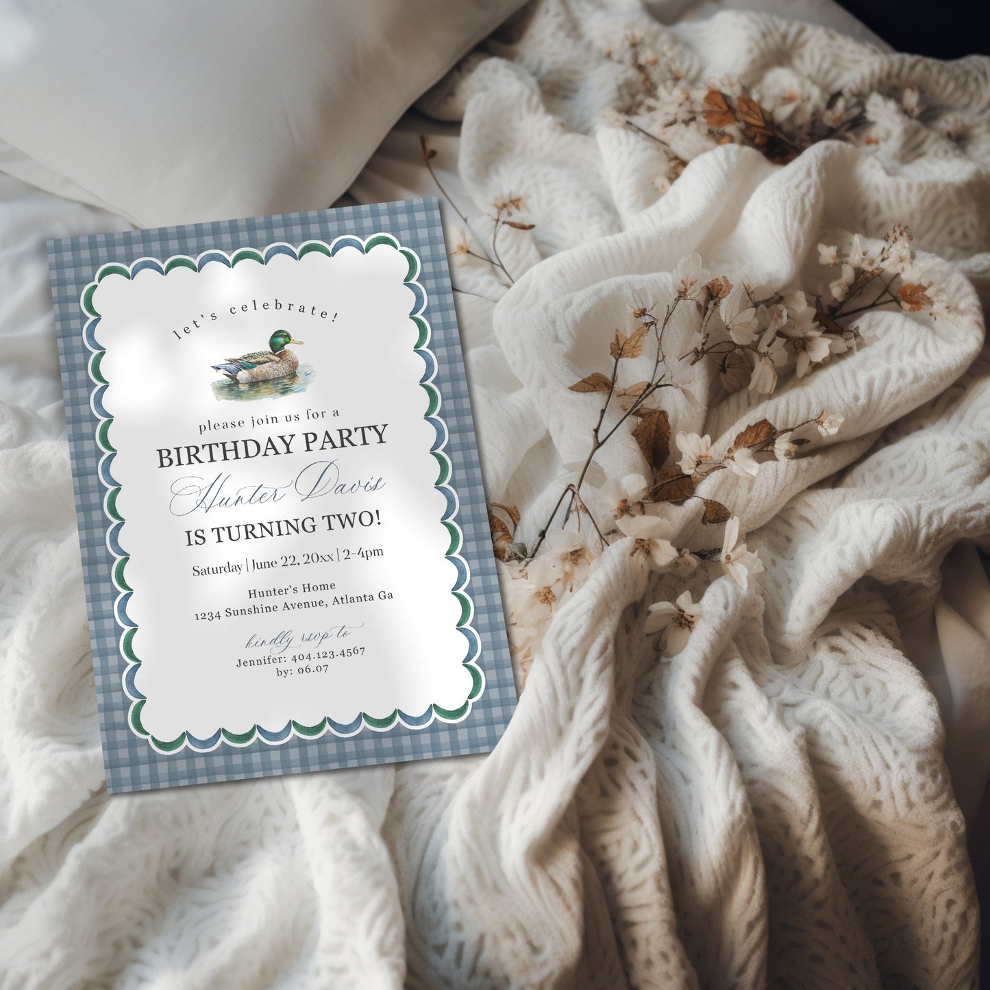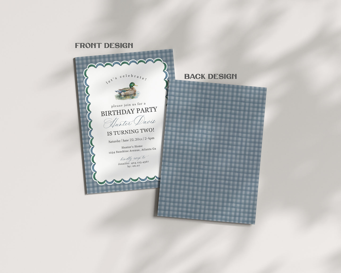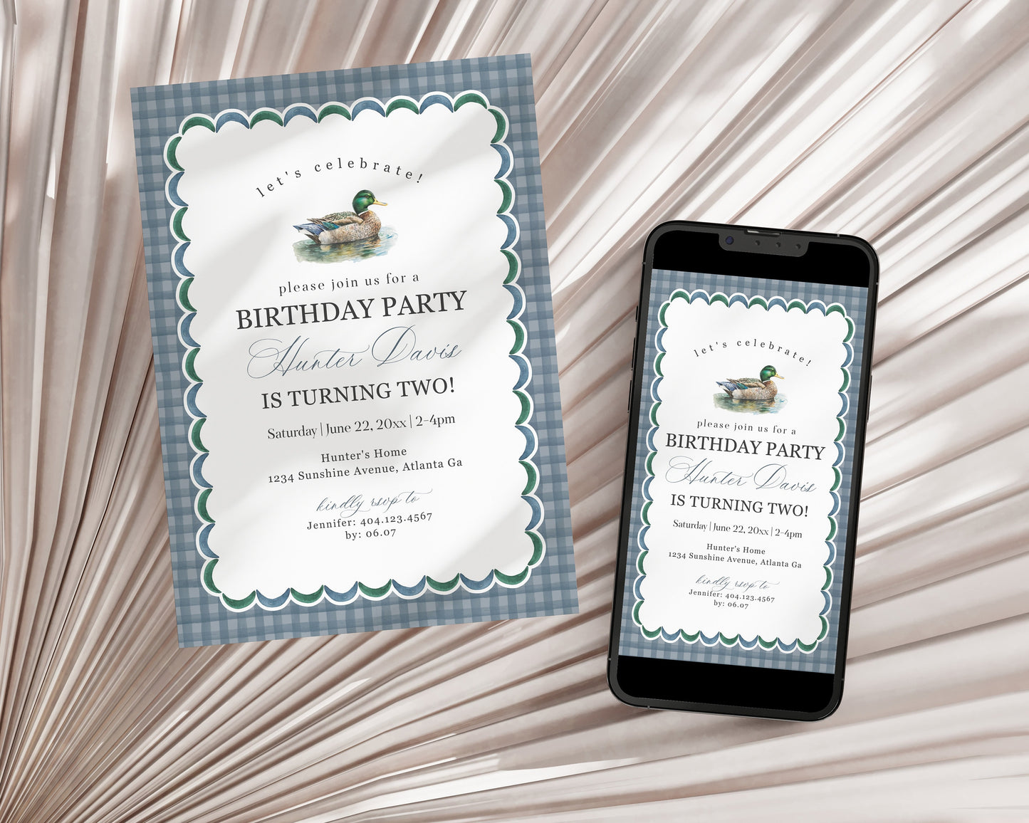 Mallard Birthday Party Invitation Printable Template, Editable One Lucky Duck Birthday Party Decor for Boy Adventure Duck Party Blue Gingham