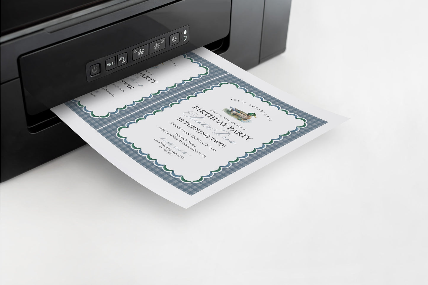 Mallard First Birthday Invitation Printable Template, Editable One Lucky Duck 1st Birthday Party Decor for Boy Adventure Party Blue Gingham