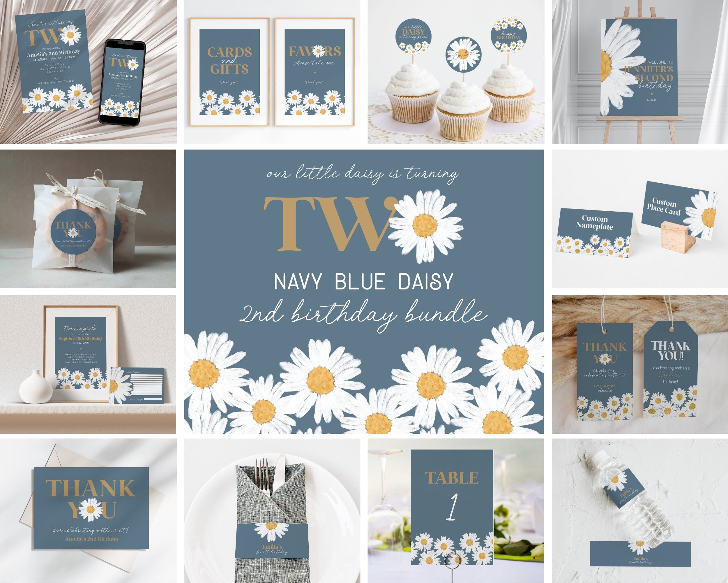 Navy Blue Daisy 2nd Birthday Bundle Printable Template