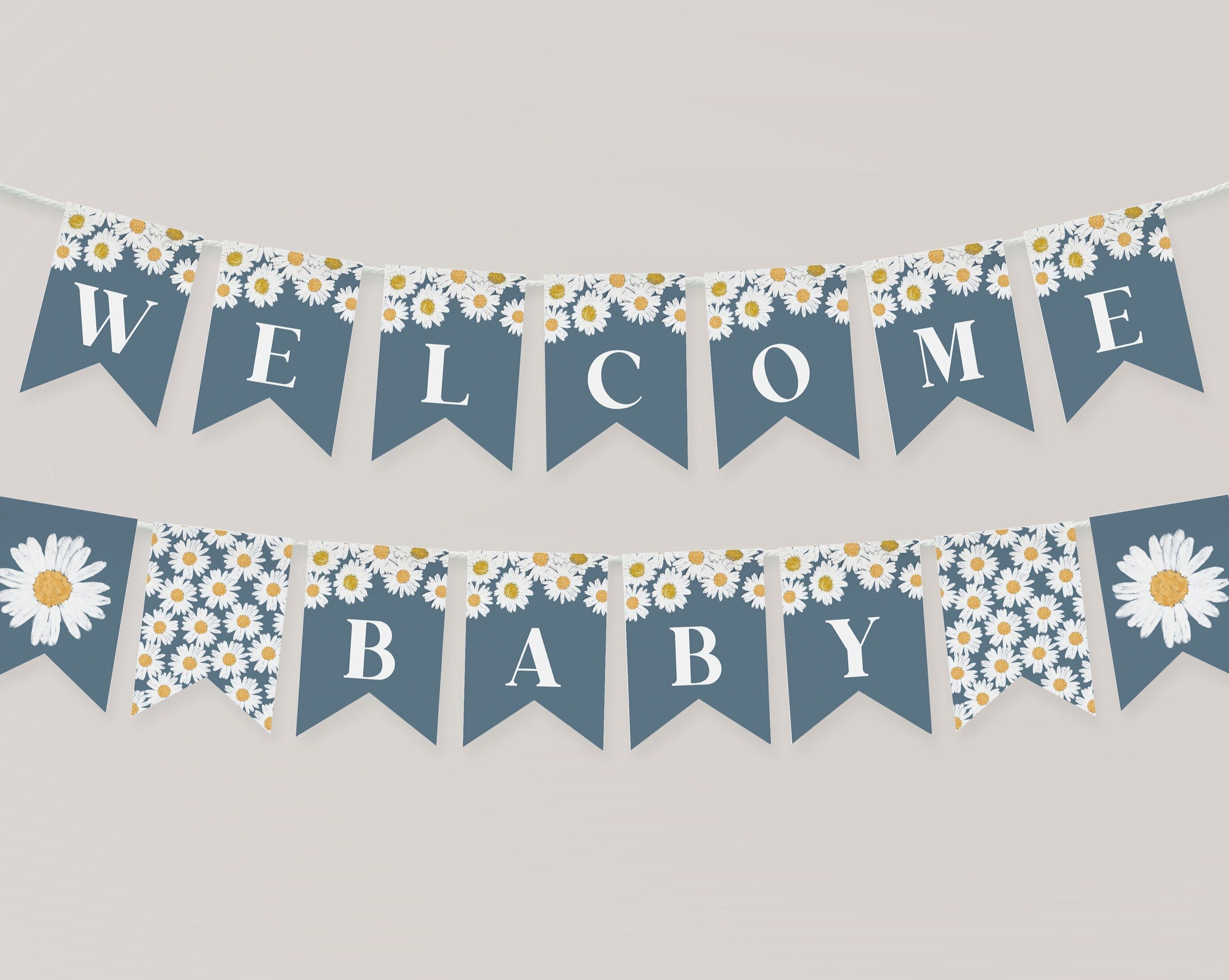 Navy Blue Daisy Baby Shower Banner Printable Template, Happy Birthday Banner for Girl Little Daisy is on the Way Baby in Bloom Oh Baby Daisy