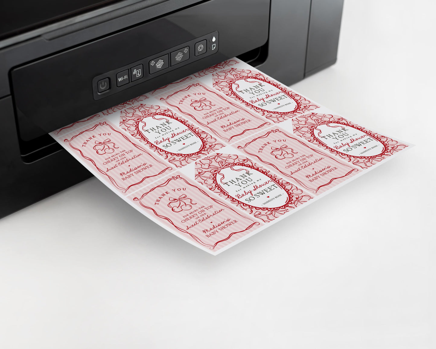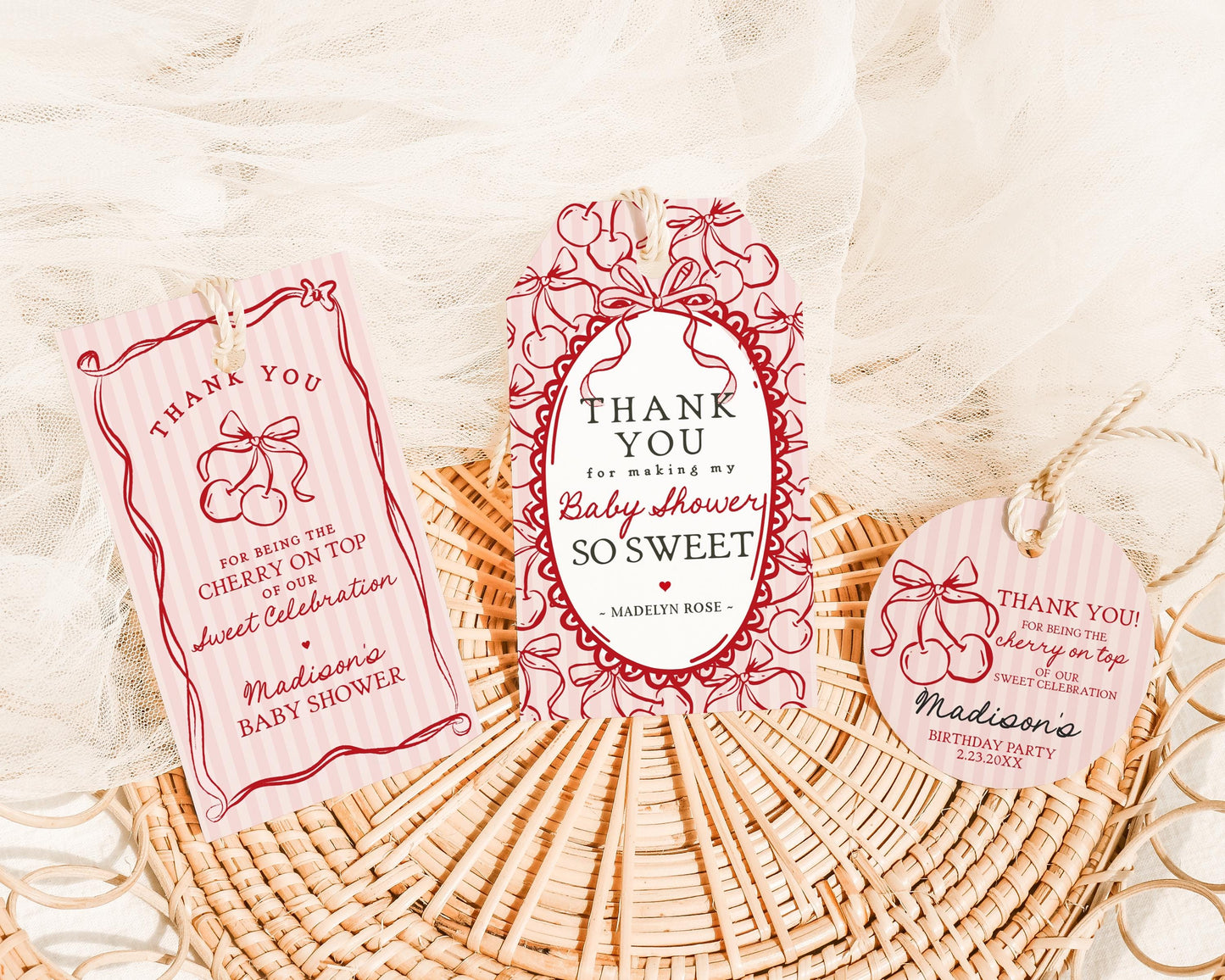 Pink Cherry Coquette Bow Baby Shower Favor Tags Template, Retro Cherry on Top Baby Sprinkle, Hand Drawn Party Decor Doodle Cherries WP1038