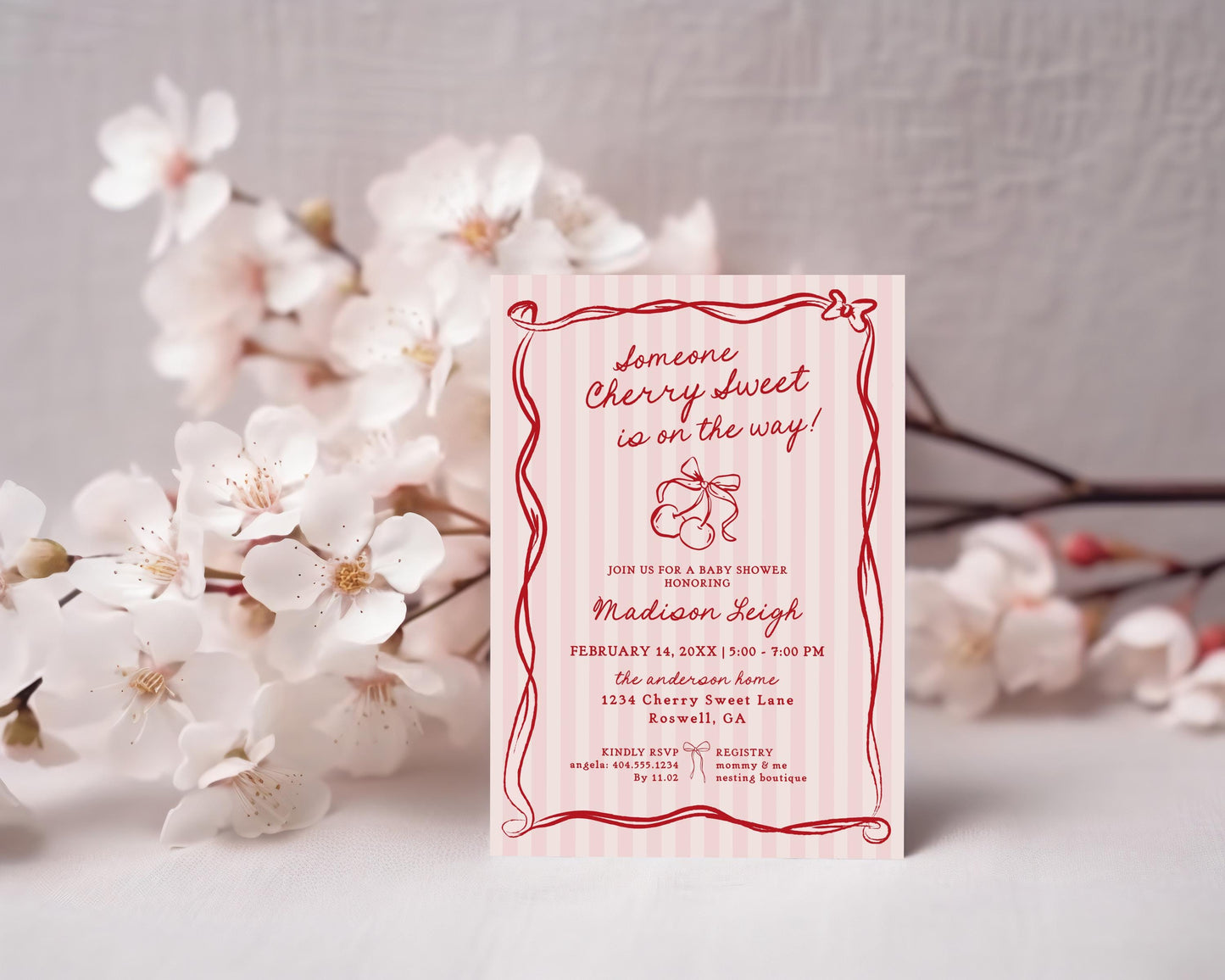 Pink Cherry Coquette Bow Baby Shower Invitation Template, Retro Cherry on Top Baby Sprinkle, Hand Drawn Party Decor Doodle Cherries WP1038