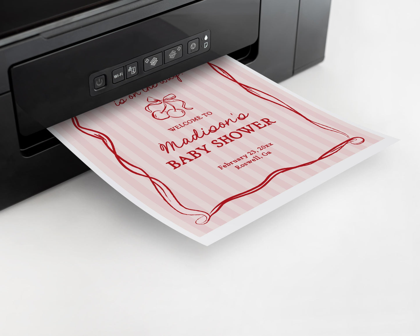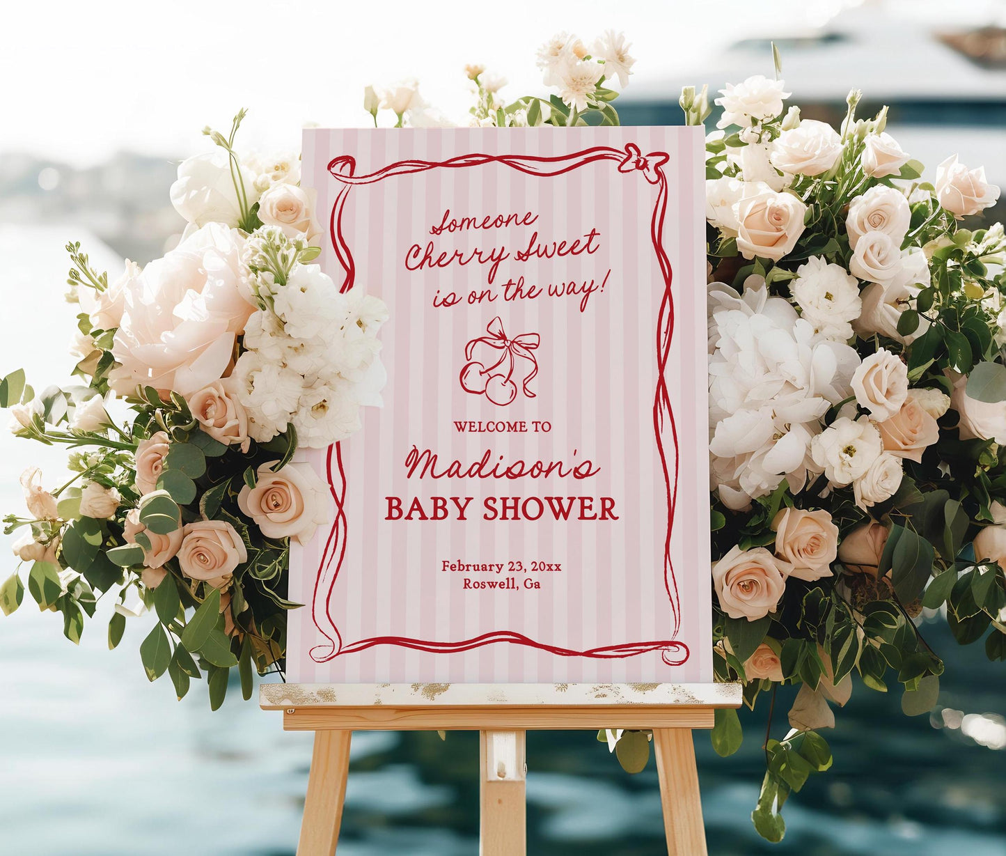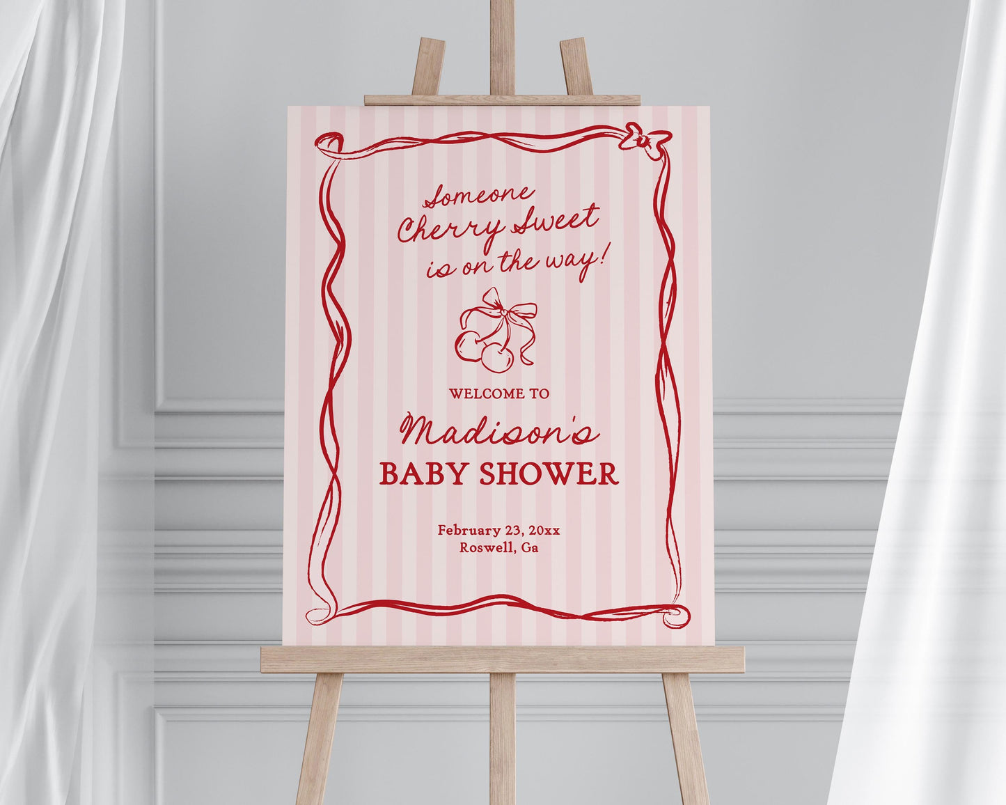 Pink Cherry Coquette Bow Baby Shower Welcome Sign Template