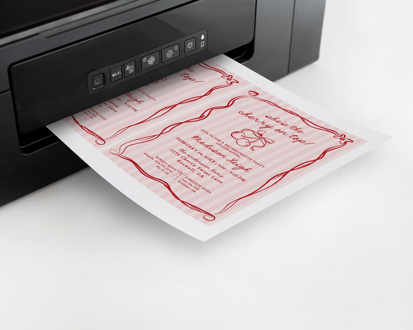 Pink Cherry Coquette Bow Bachelorette Party Invitation Template, Retro Cherry on Top Theme Hen Party, Hand Drawn Party Decor Cherries WP1038