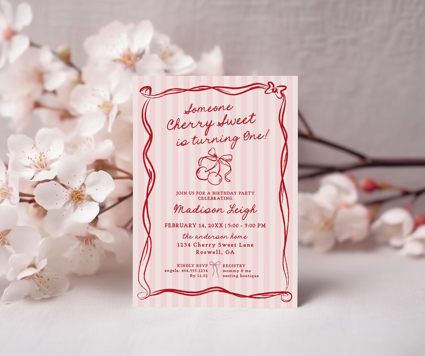 Pink Cherry Coquette Bow Birthday Invitation Printable Template, Retro Cherry on Top Theme Bday, Hand Drawn Cherry First Party Decor WP1038