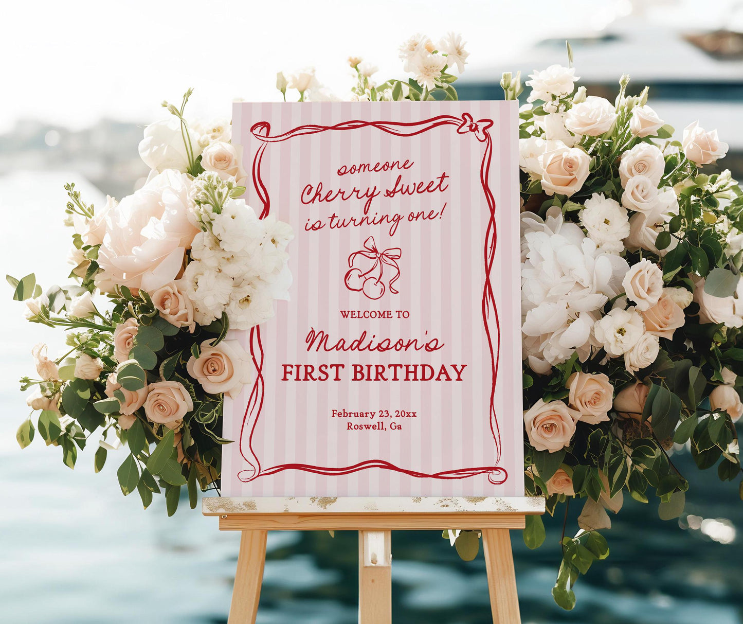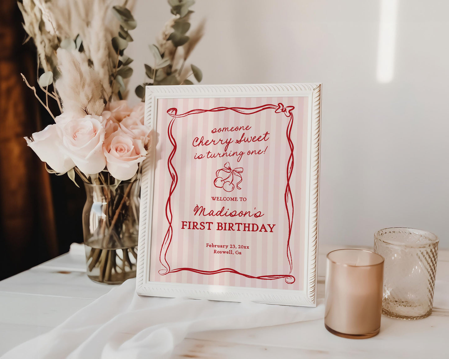 Pink Cherry Coquette Bow Birthday Welcome Sign Template, Retro Cherry on Top Theme 1st Birthday, Hand Drawn Cherry First Party Decor WP1038