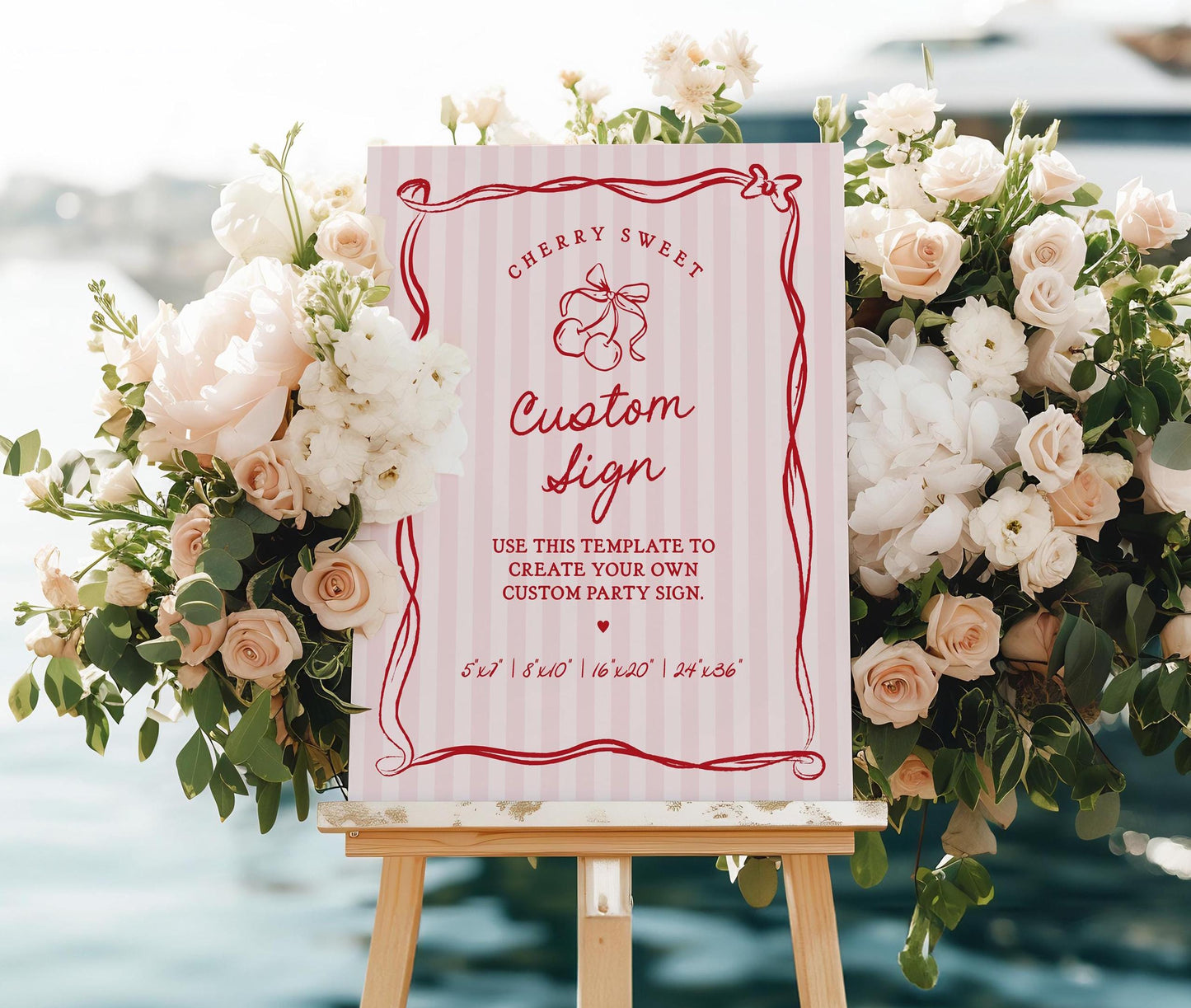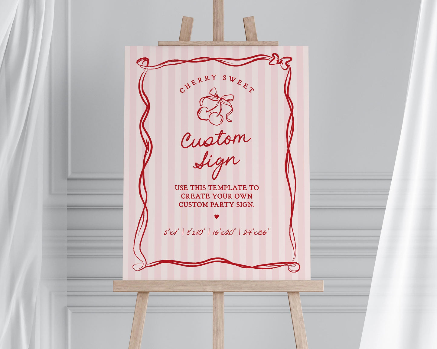 Pink Cherry Coquette Bow Custom Sign Template, Retro Cherry on Top Baby Shower, Cherry Sweet Bridal Shower, Hand Drawn Birthday Decor WP1038