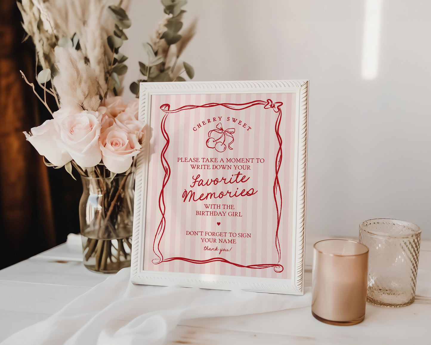 Pink Cherry Coquette Bow Favorite Memories Birthday Girl Template, Retro Cherry on Top Birthday, Hand Drawn Cherry Fruit Party Decor WP1038