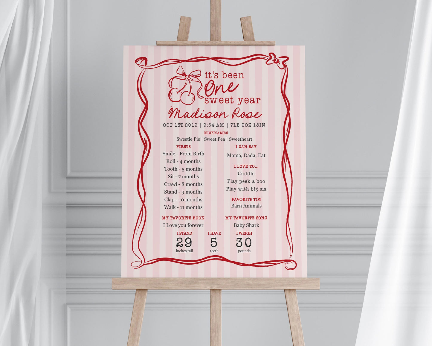 Pink Cherry Coquette Bow First Year Milestone Sign Printable Template, Retro Cherry on Top Cherry 1st Birthday Hand Drawn Party Decor WP1038