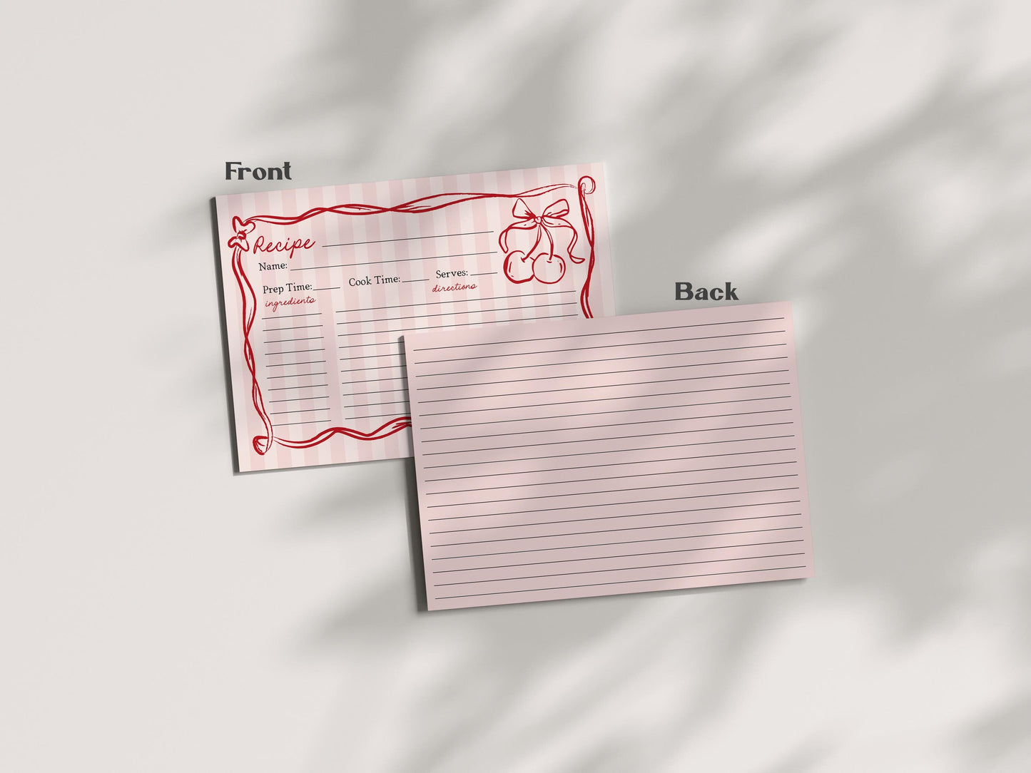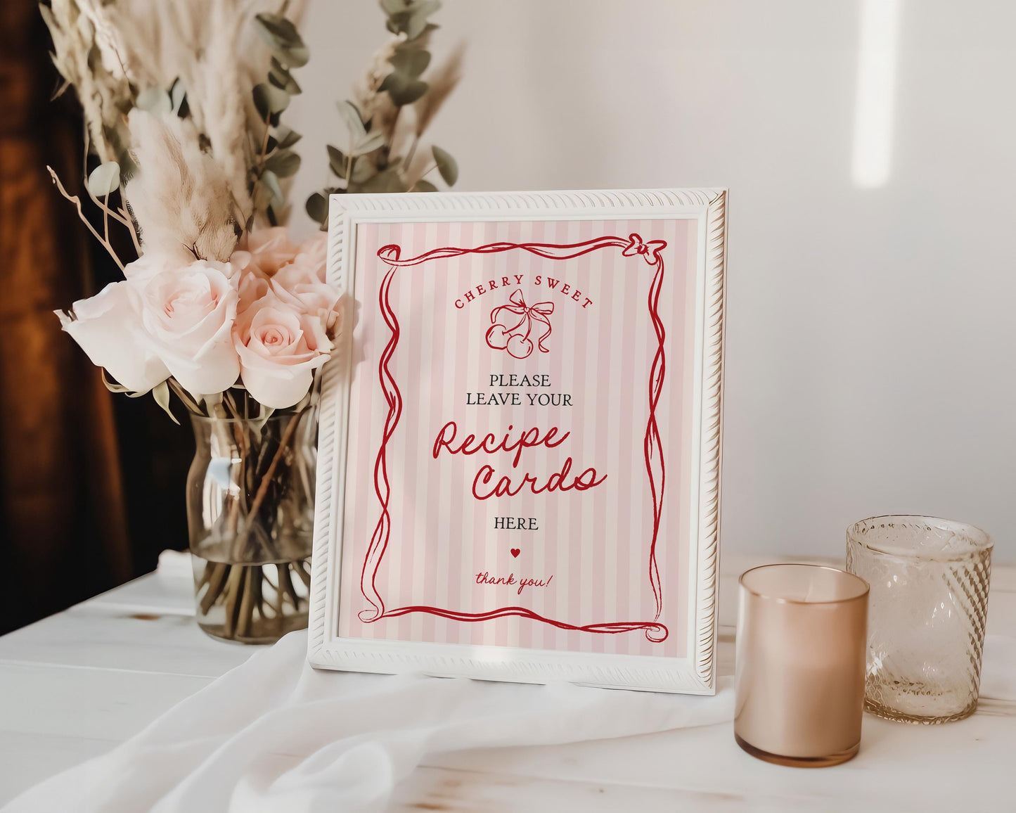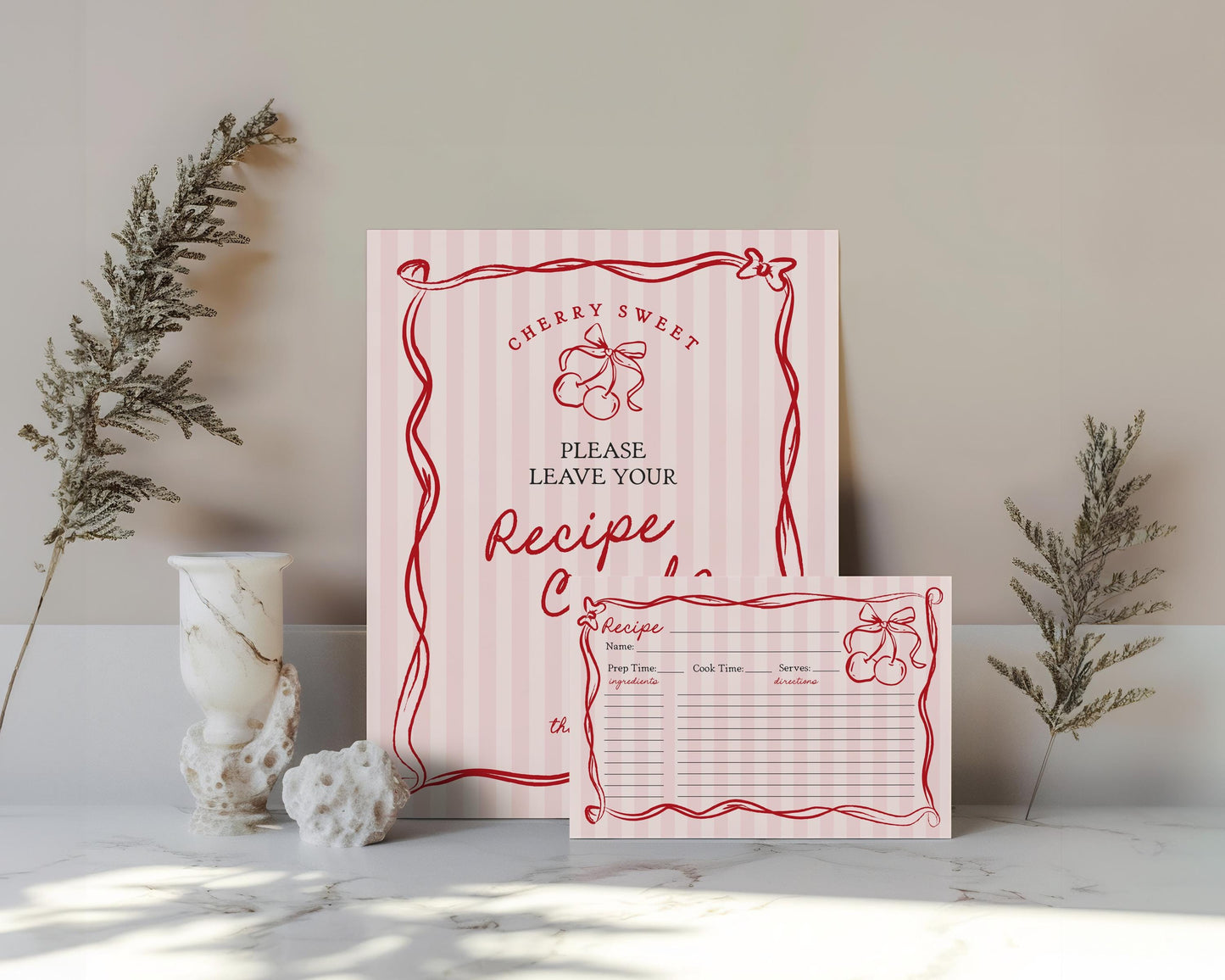 Pink Cherry Coquette Bow Recipe Card Bridal Shower Template, Retro Cherry on Top Theme Bridal Brunch, Hand Drawn Fruit Party Decor WP1038