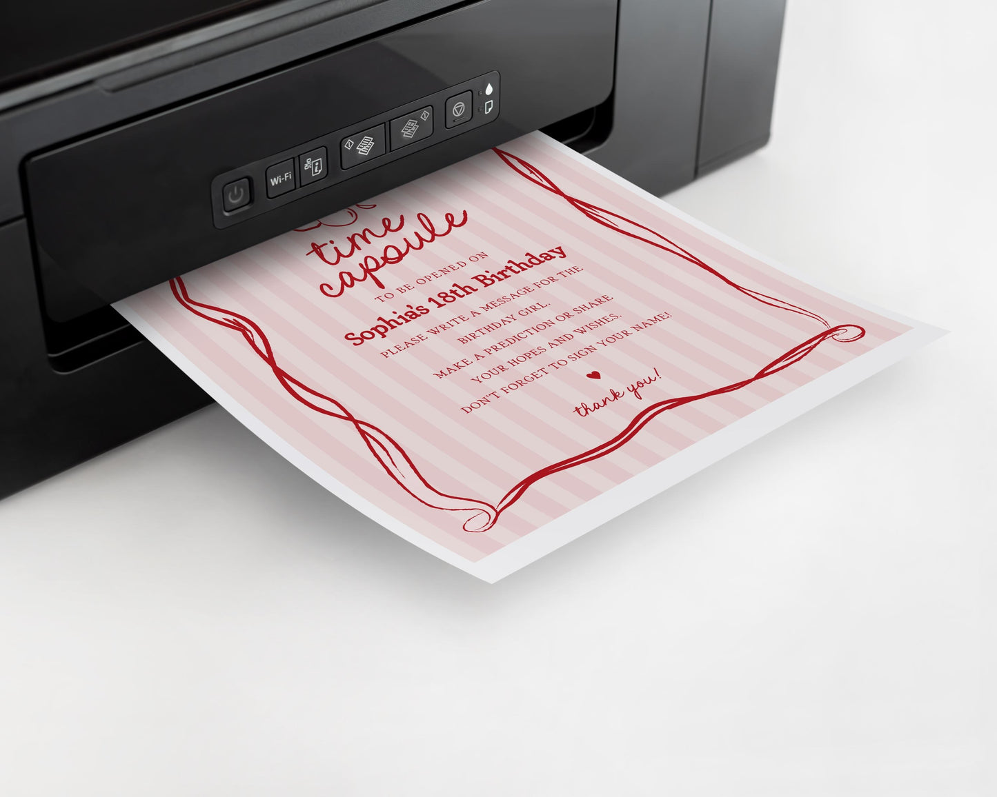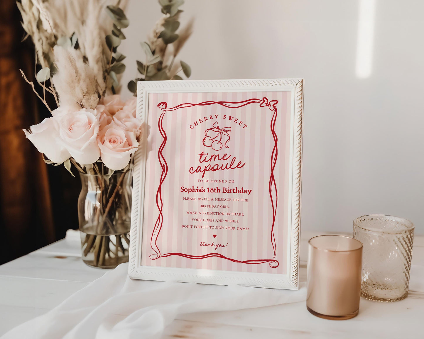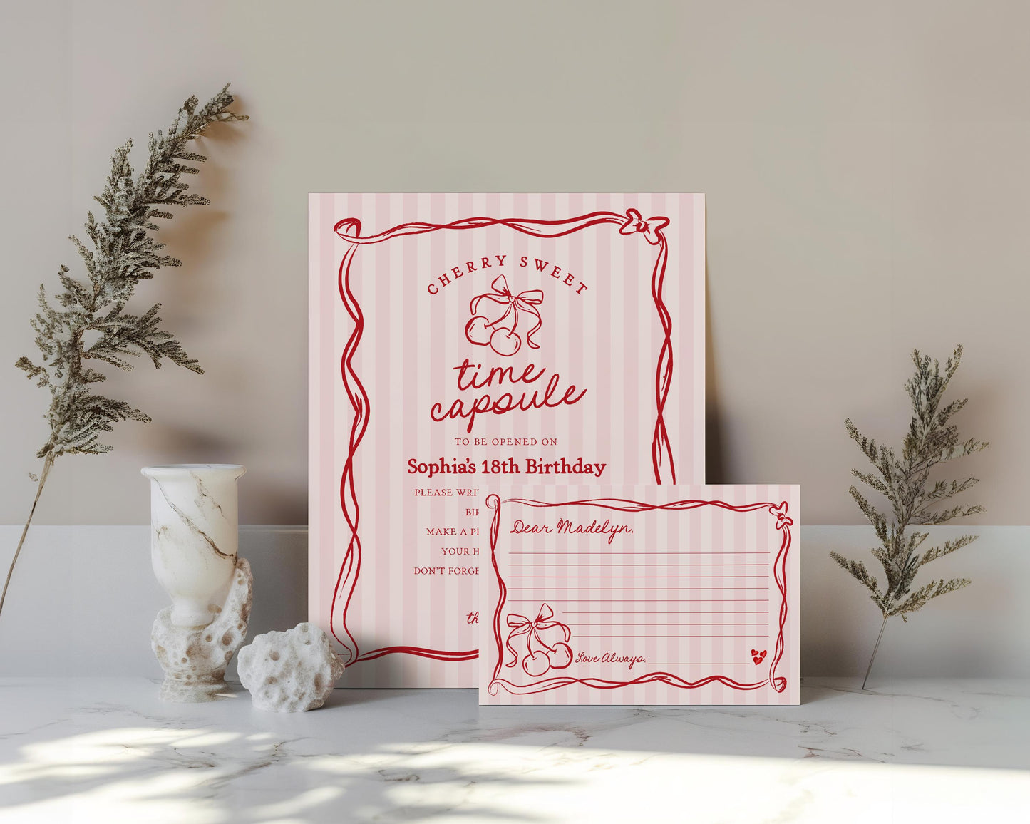 Pink Cherry Coquette Bow Time Capsule Template, Retro Cherry on Top Theme 1st Birthday, Hand Drawn Cherry First Party Decor WP1038