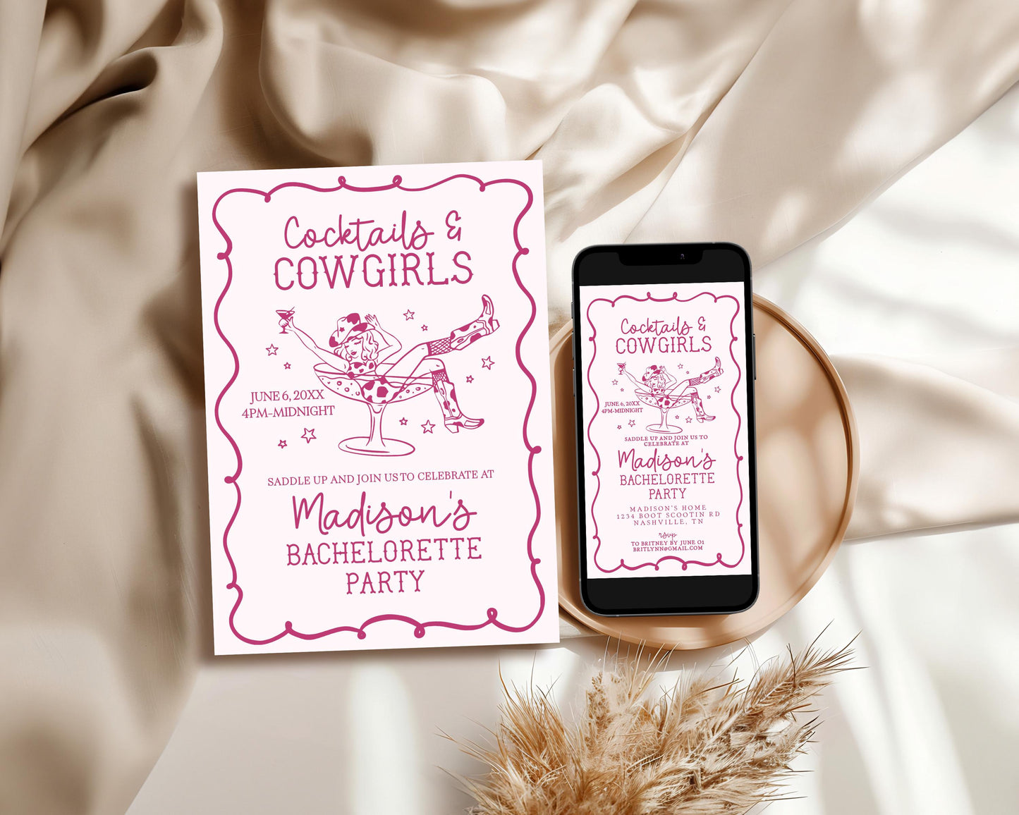 Pink Cocktails and Cowgirls Bachelorette Invite Template, Western Nash Bash, Brides Last Rodeo Bach Weekend, Boots Bubbly Hen Party WP1040