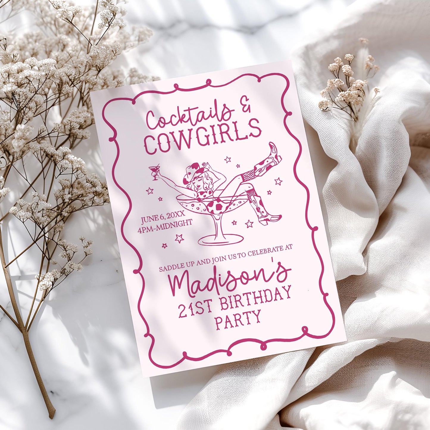 Pink Cocktails and Cowgirls Birthday Invitation Template