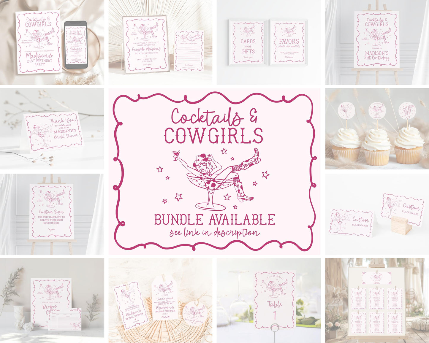 Pink Cocktails and Cowgirls Cards & Gifts, Favors Sign Template, Western Bridal Shower, Nashville Birthday, Last Rodeo Bachelorette WP1040