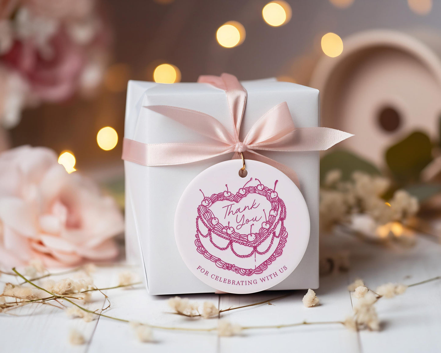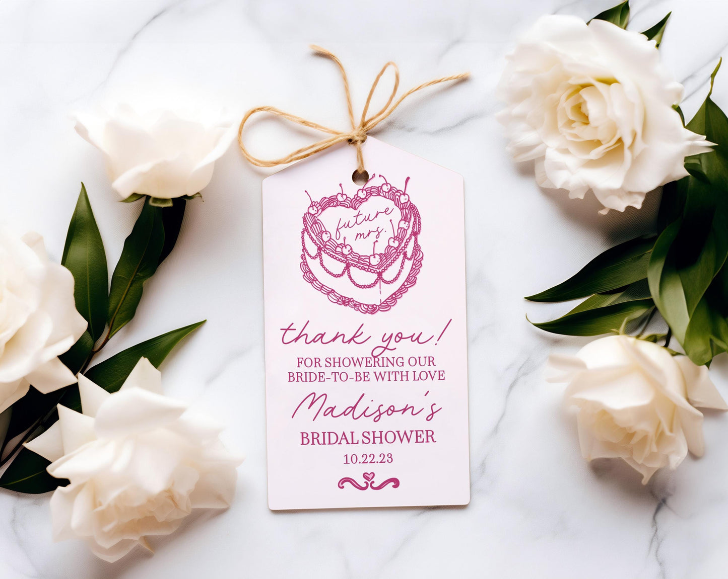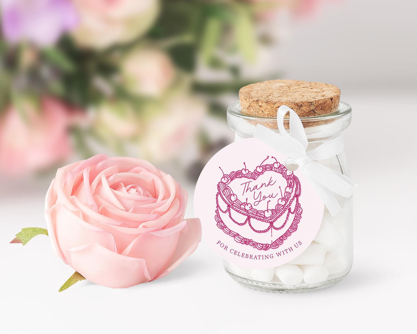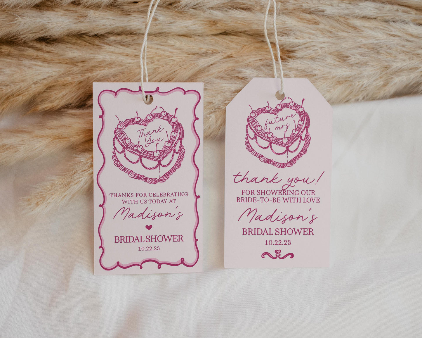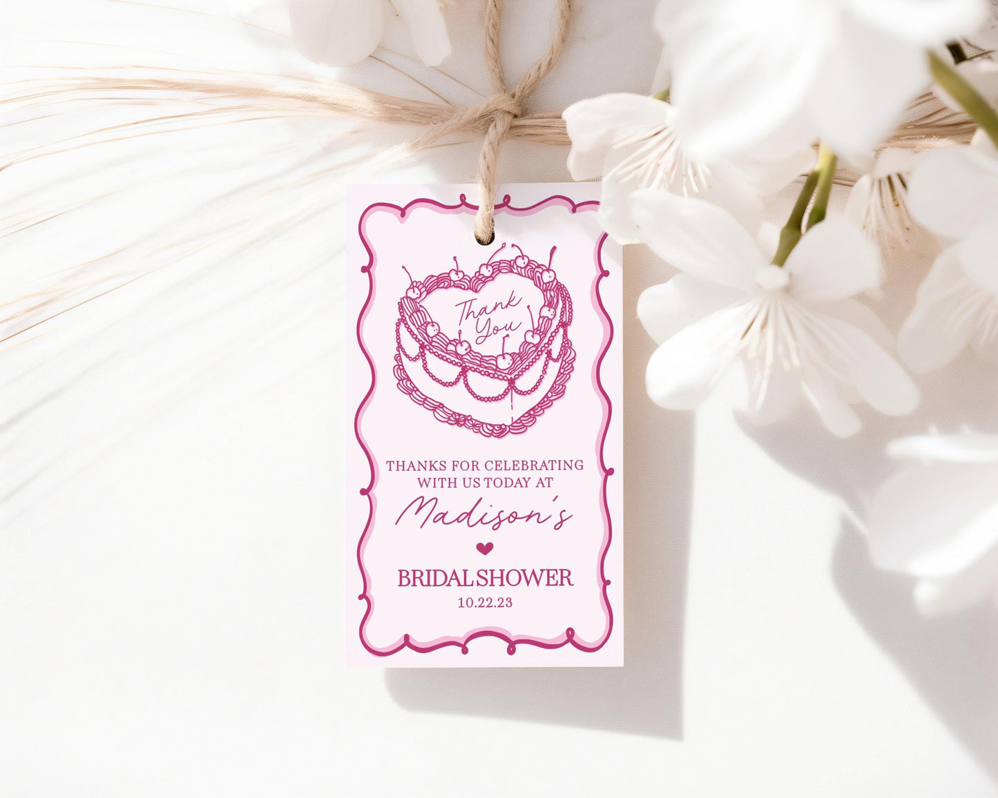 Pink Coquette Heart Cake Bridal Shower Favor Tags Printable Template, Vintage Cherry Sweet Theme Retro Wedding Cake Bridal Brunch WP1008