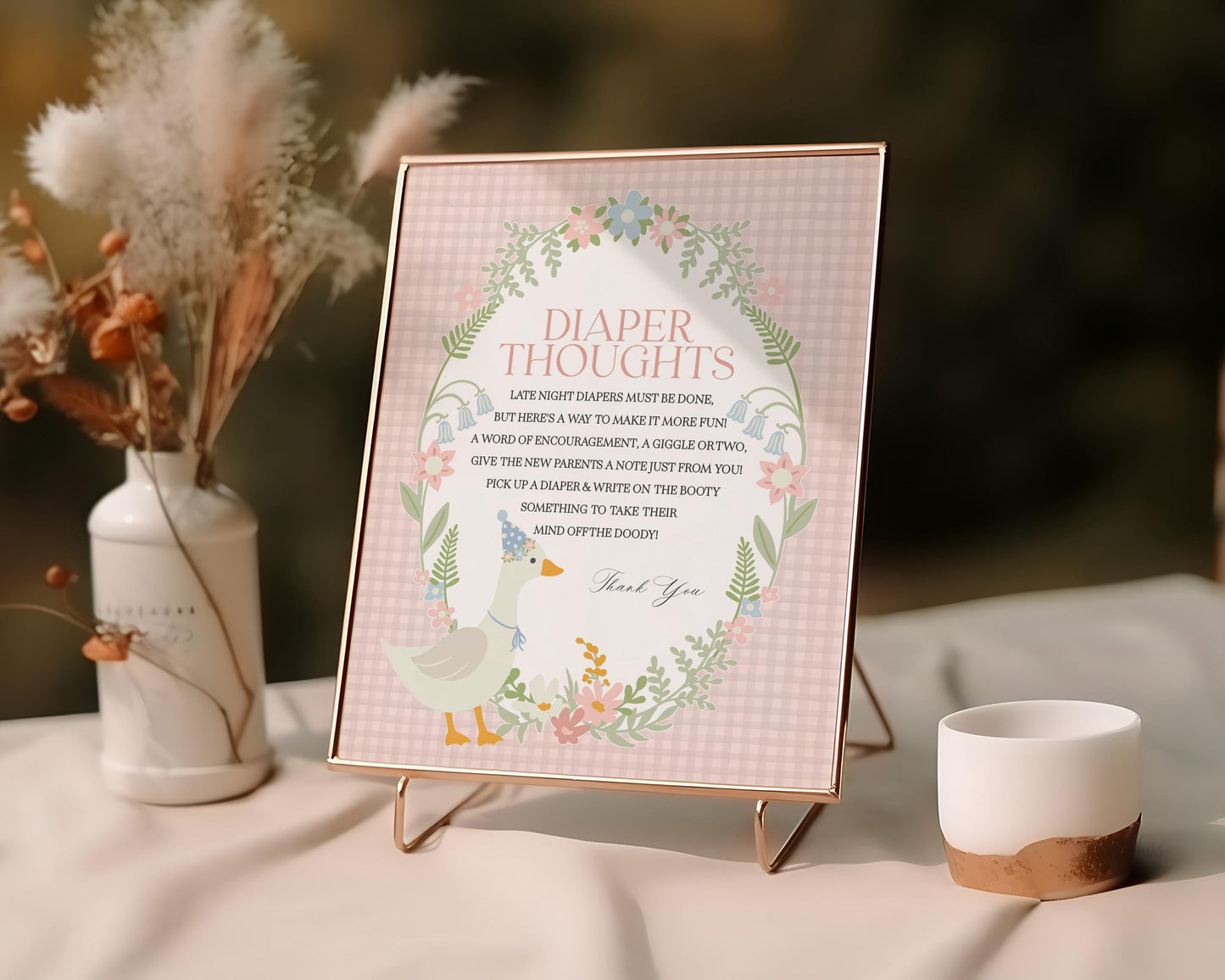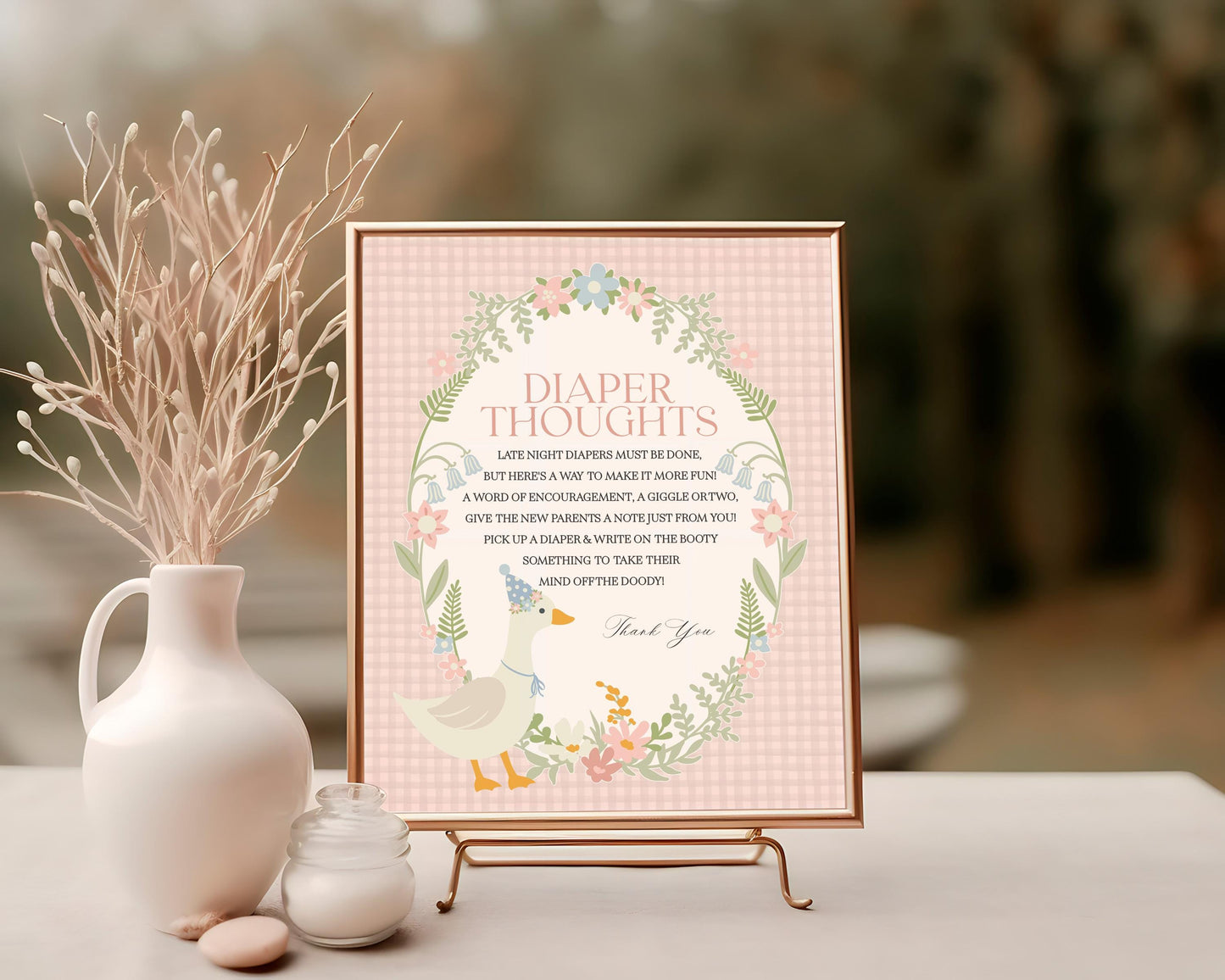 Pink Floral Silly Goose Baby Shower Diaper Thoughts Printable Template, Little Duck Theme Shower Girl, Pastel Gingham Baby Sprinkle WP1022