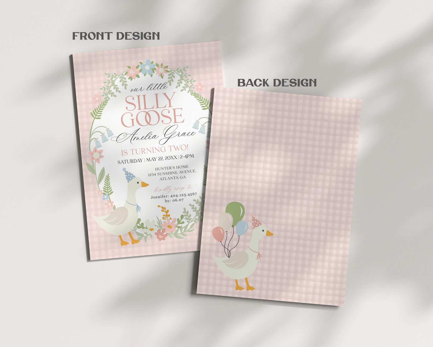 Pink Floral Silly Goose Birthday Invitation Printable Template, Little Duck Theme Birthday Girl, Pastel Floral Gingham Birthday WP1022