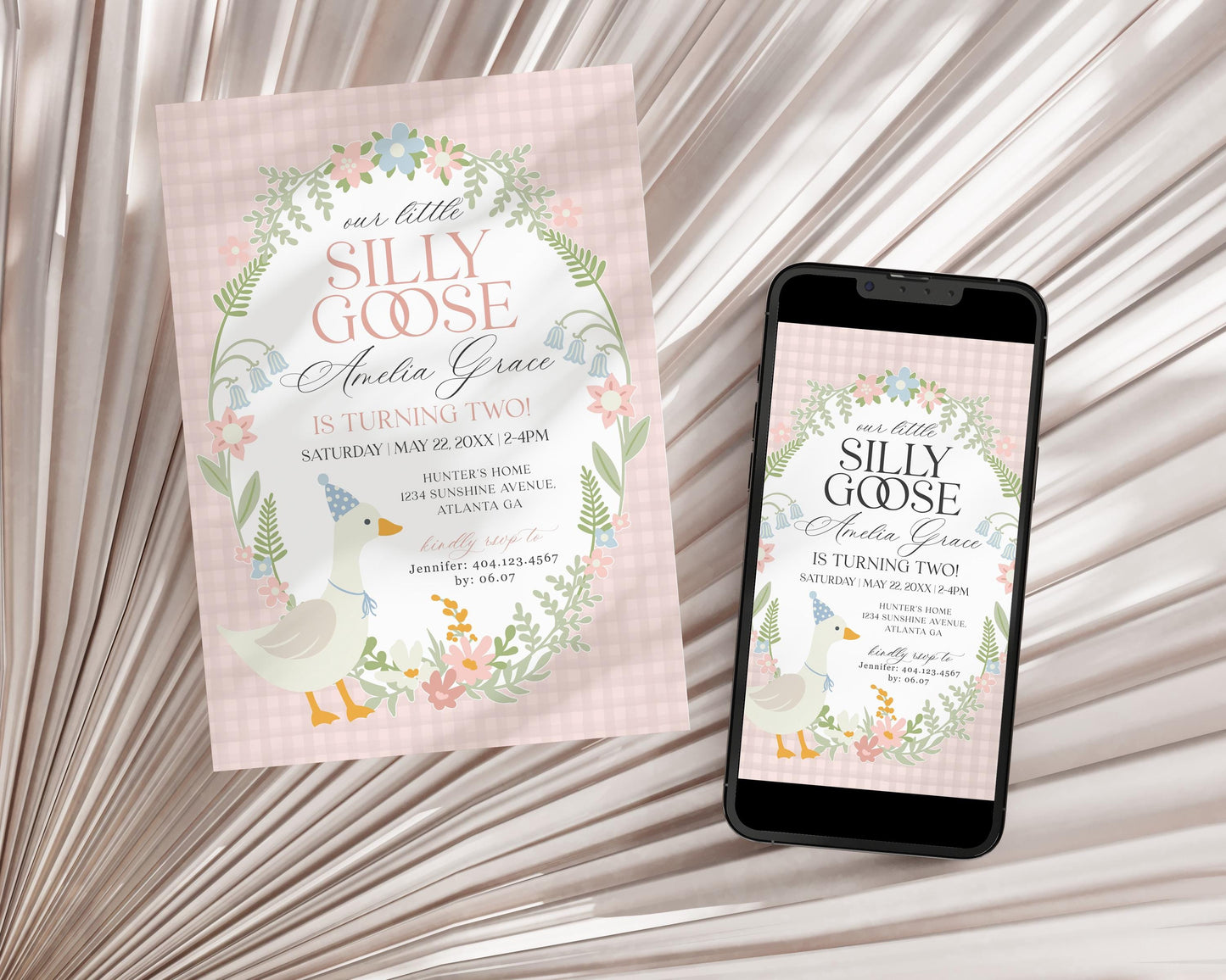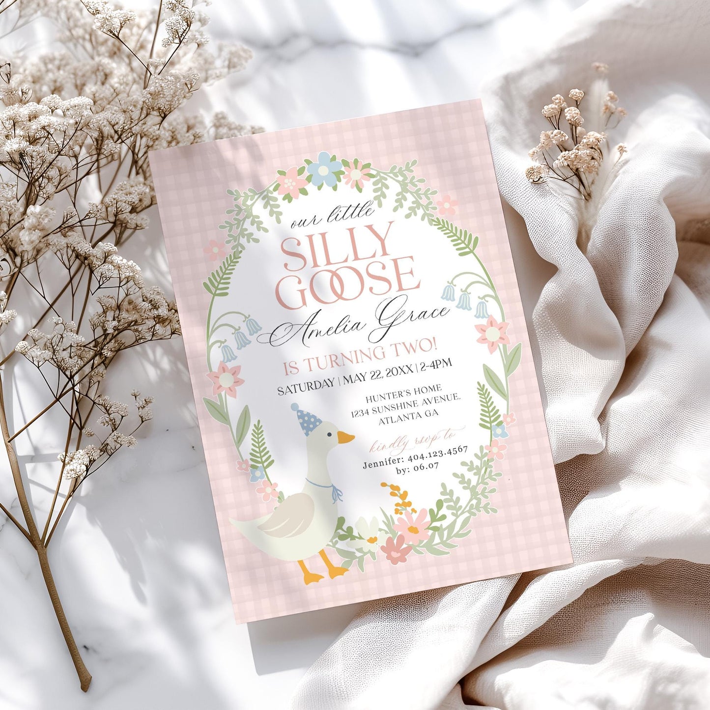 Pink Floral Silly Goose First Birthday Invitation Printable Template