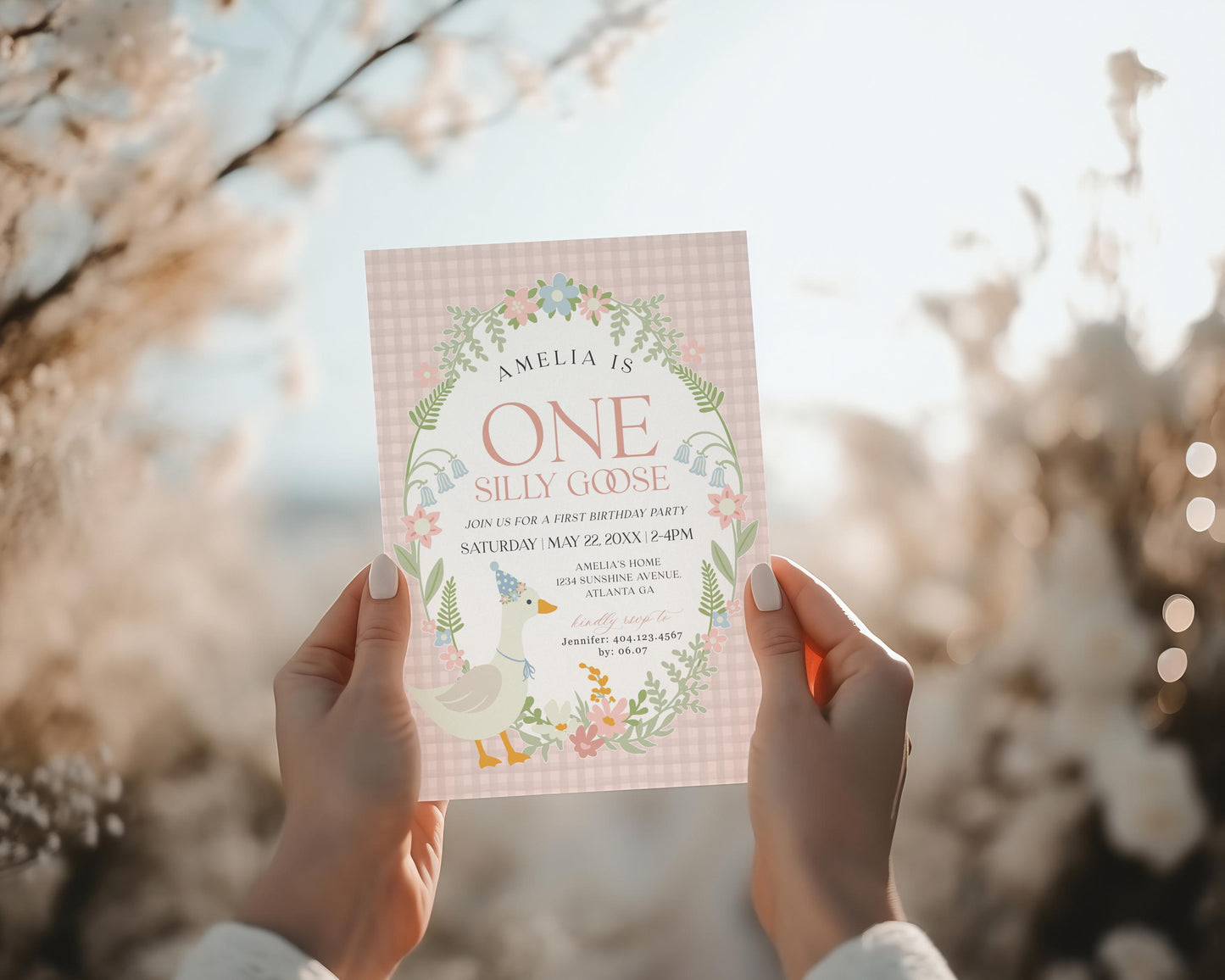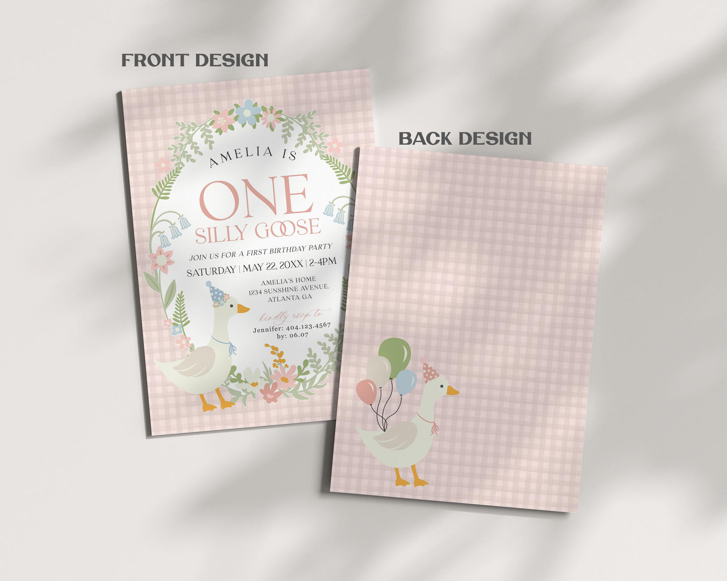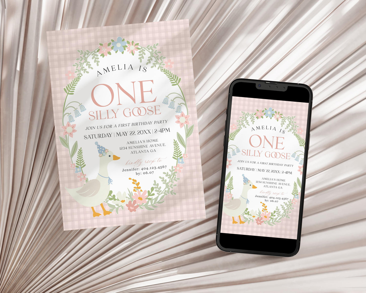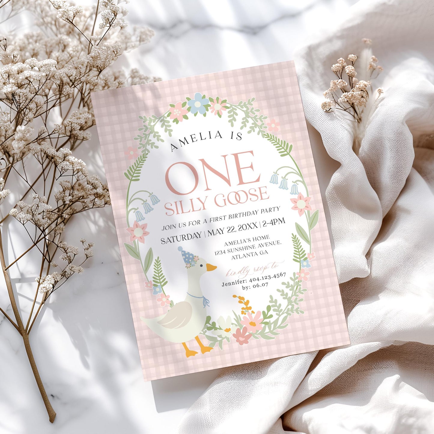 Pink Floral Silly Goose First Birthday Invitation Printable Template, Little Duck Theme Birthday Girl, Pastel Floral Gingham Birthday WP1022