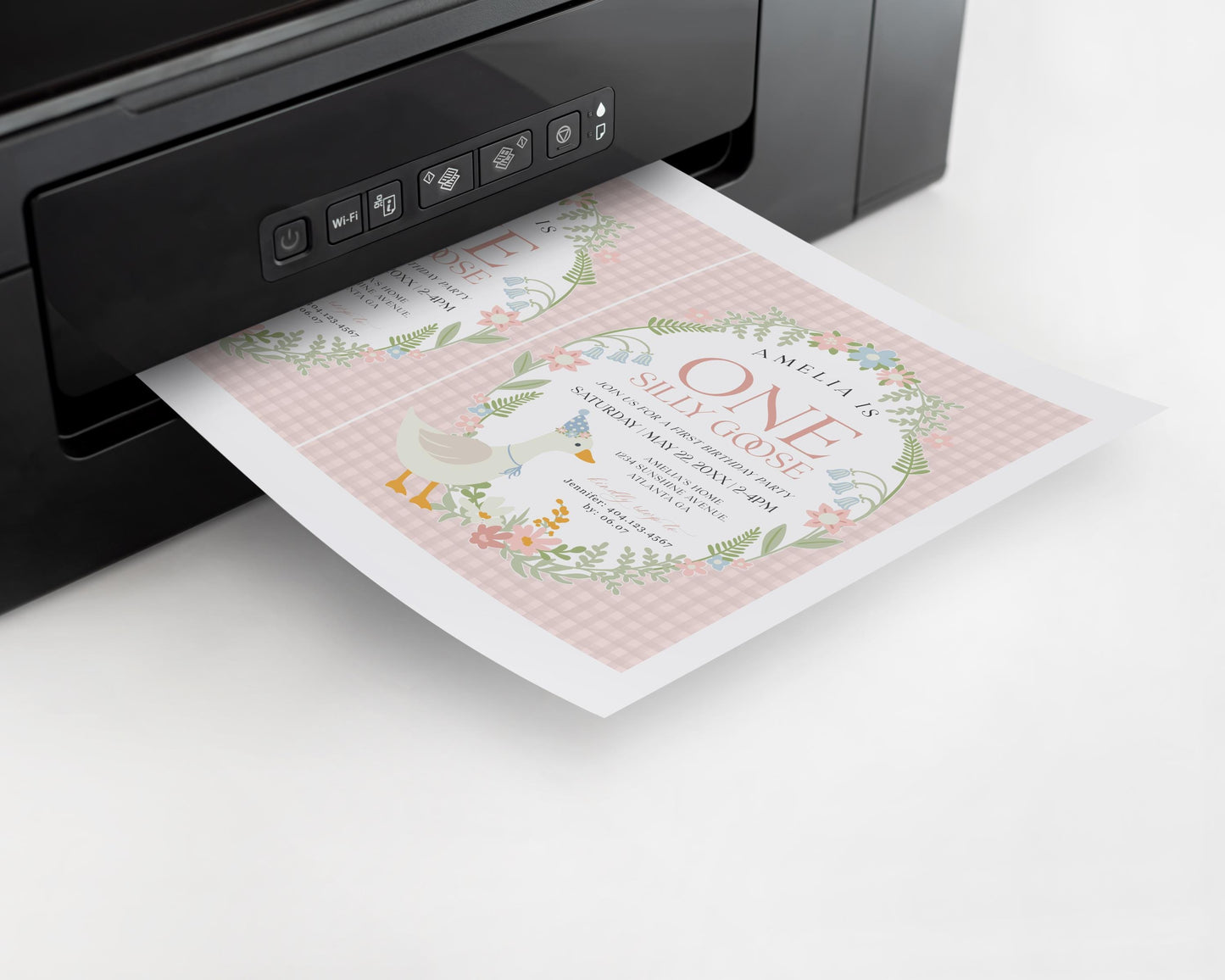 Pink Floral Silly Goose First Birthday Invitation Printable Template