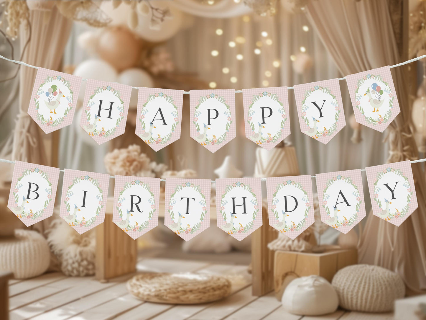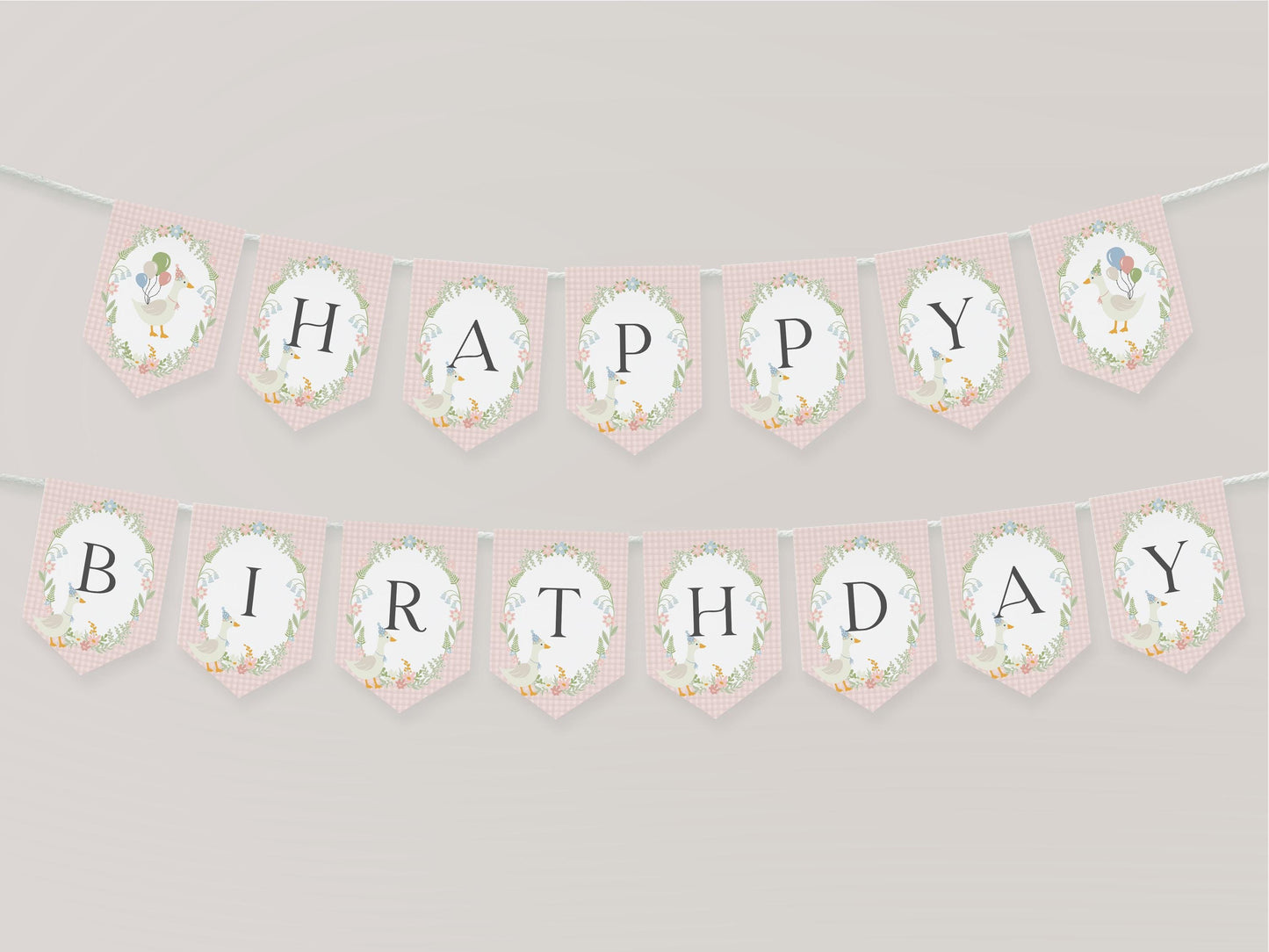 Pink Floral Silly Goose Happy Birthday Banner Printable Template, Little Duck Theme Birthday Girl, Pastel Gingham Birthday Party WP1022