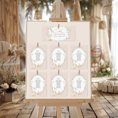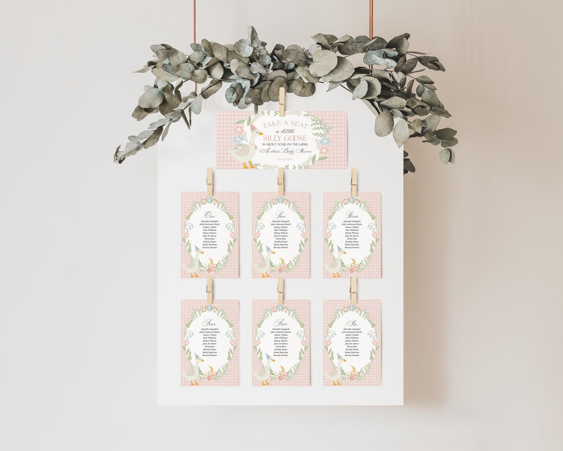Pink Floral Silly Goose Seating Chart Cards Printable Template, Little Duck Theme Girl Birthday, Pastel Gingham Baby Shower Sprinkle WP1022