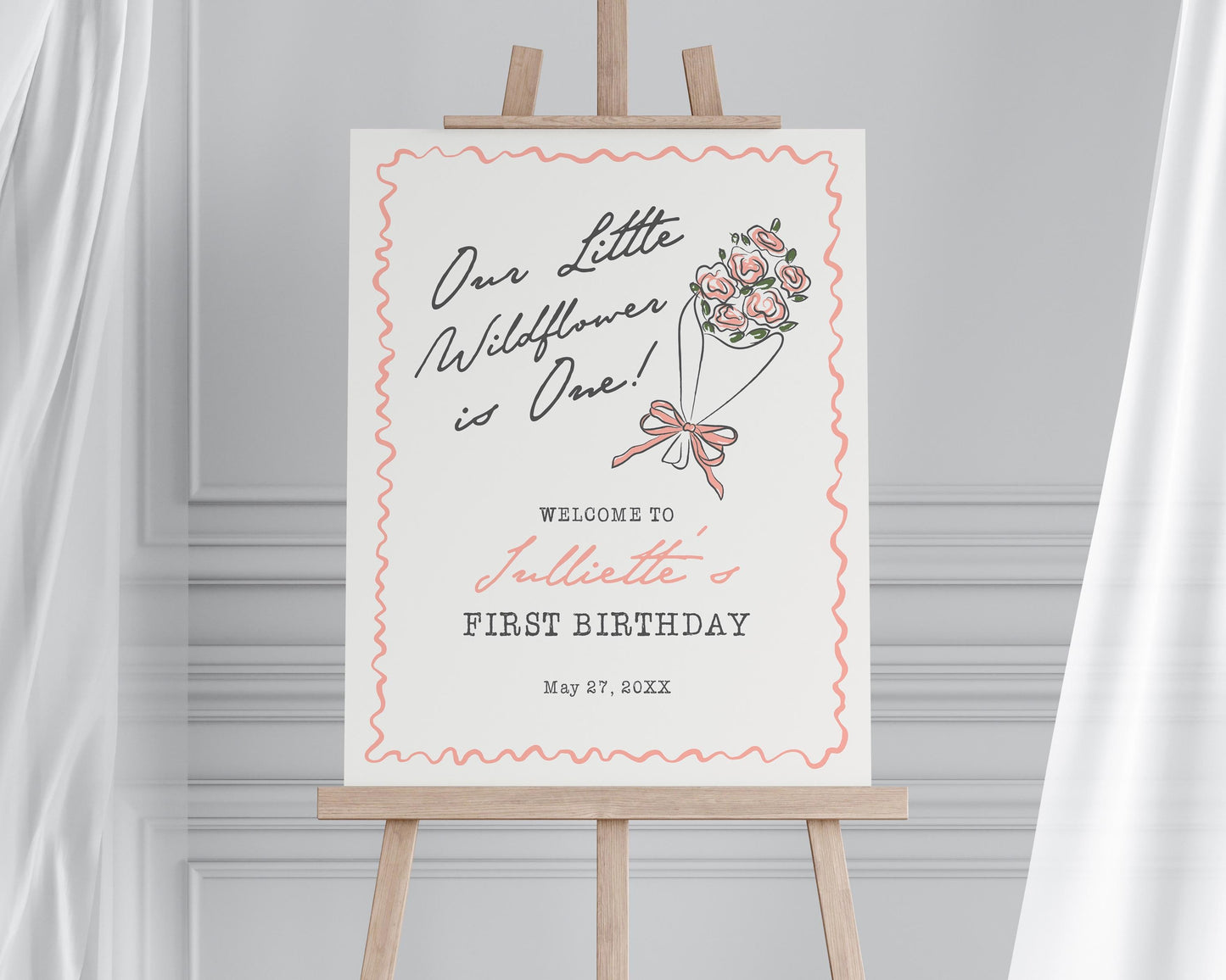 Pink Flower Market Birthday Welcome Sign Template, Little Wildflower Birthday Party for Girl, Hand Drawn Pink Coquette Floral Doodle WP1044