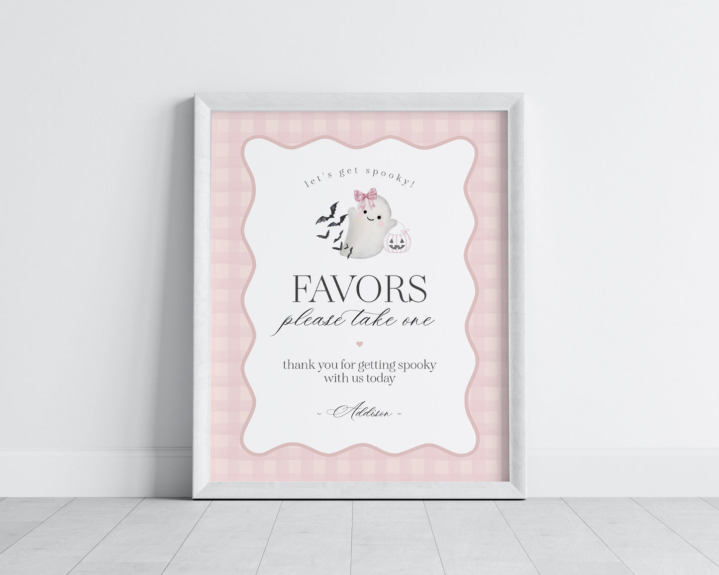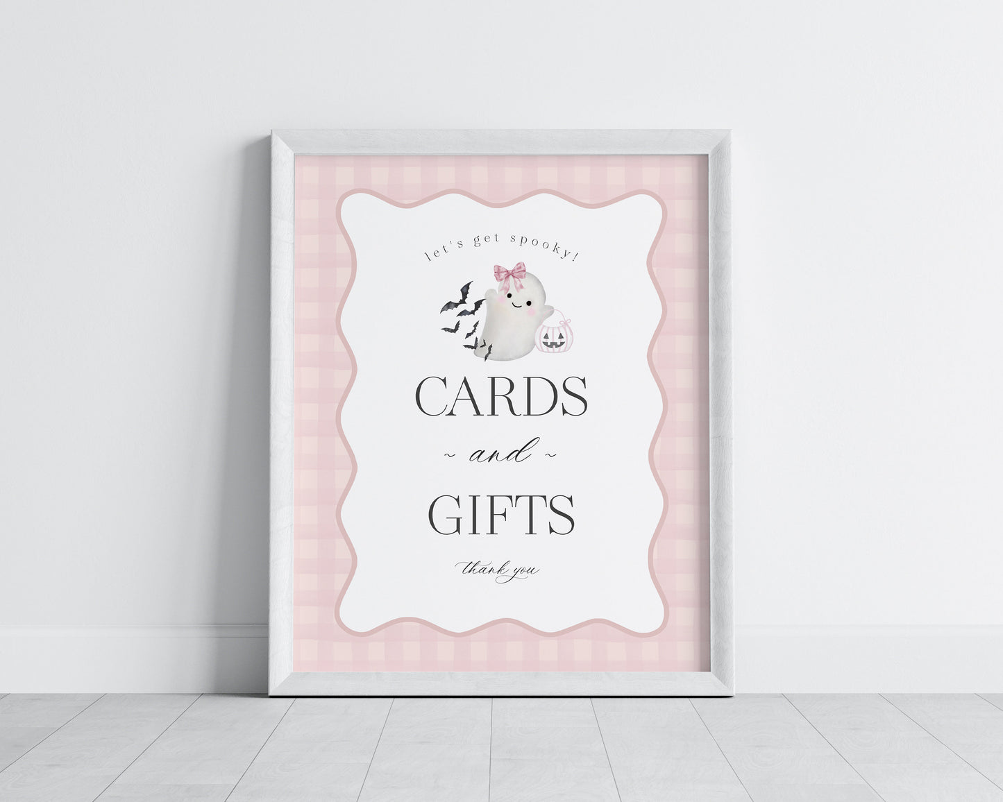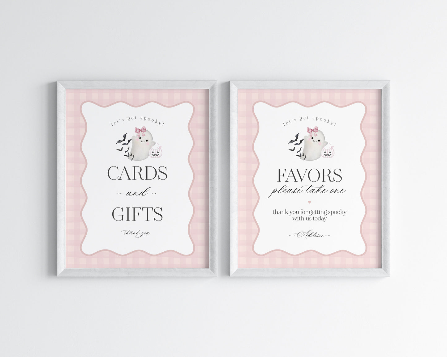 Pink Ghost Cards & Gifts and Favors Sign Printable Template, Preppy Gingham Halloween Birthday Party for Fall October Bday, Cute Ghost Theme