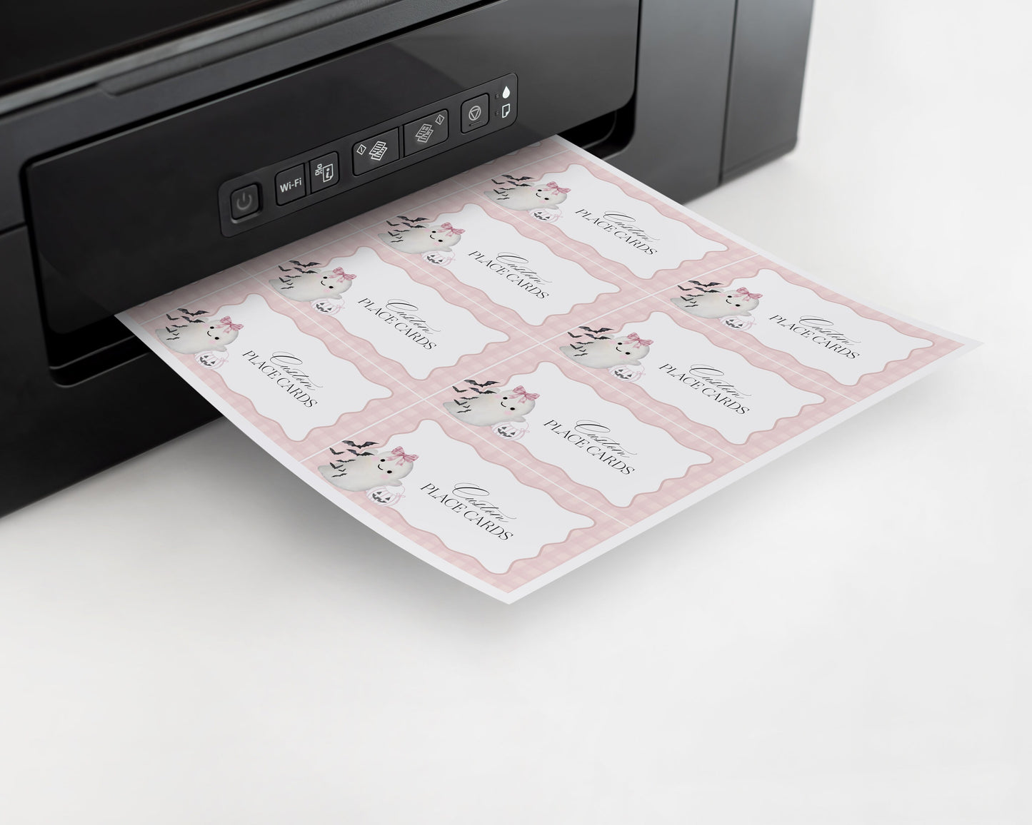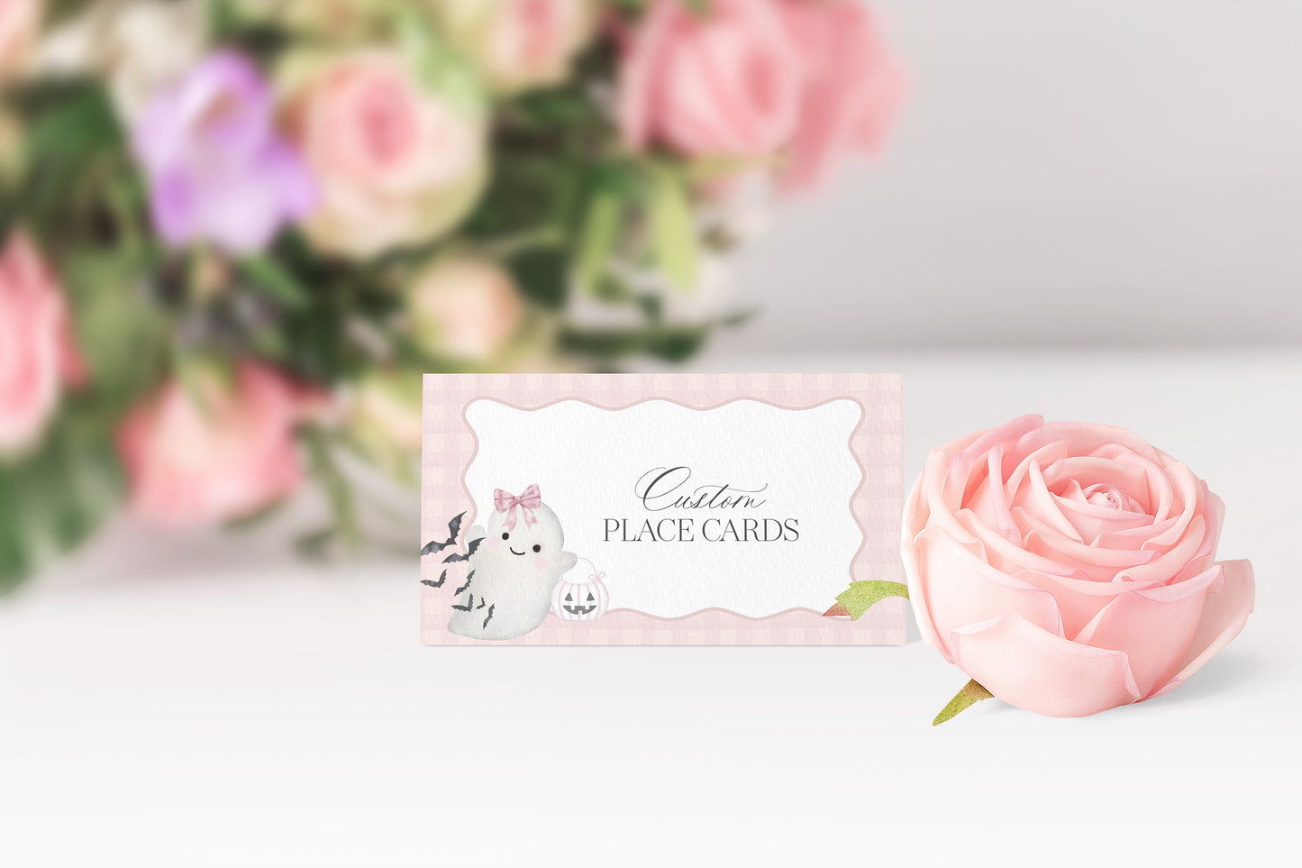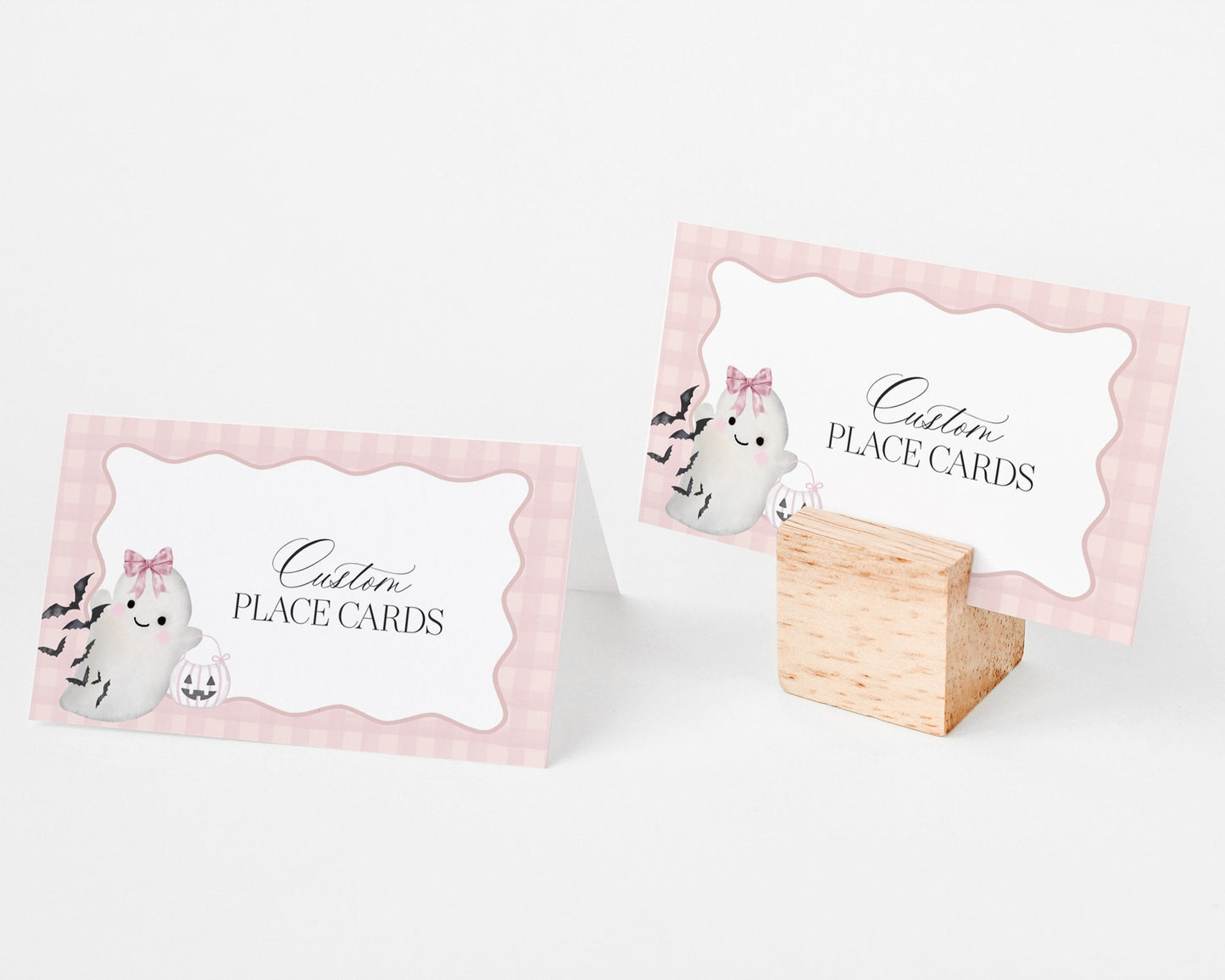 Pink Ghost Place Cards Baby Shower Printable Template, Preppy Gingham Halloween Birthday Party for Fall October Bday, Cute Ghost Theme Party