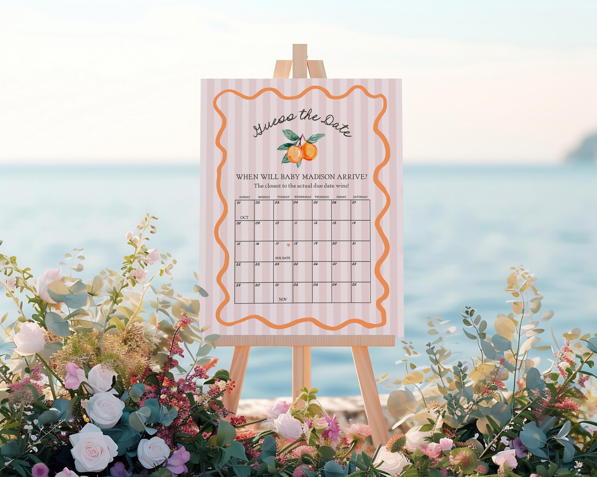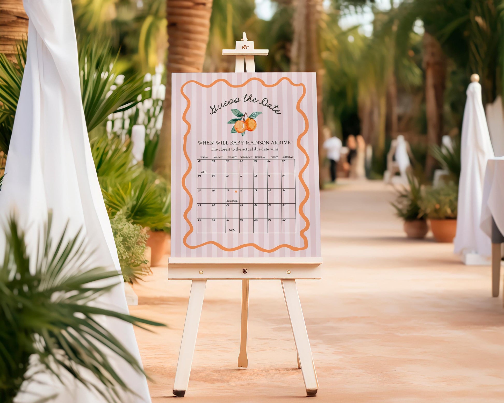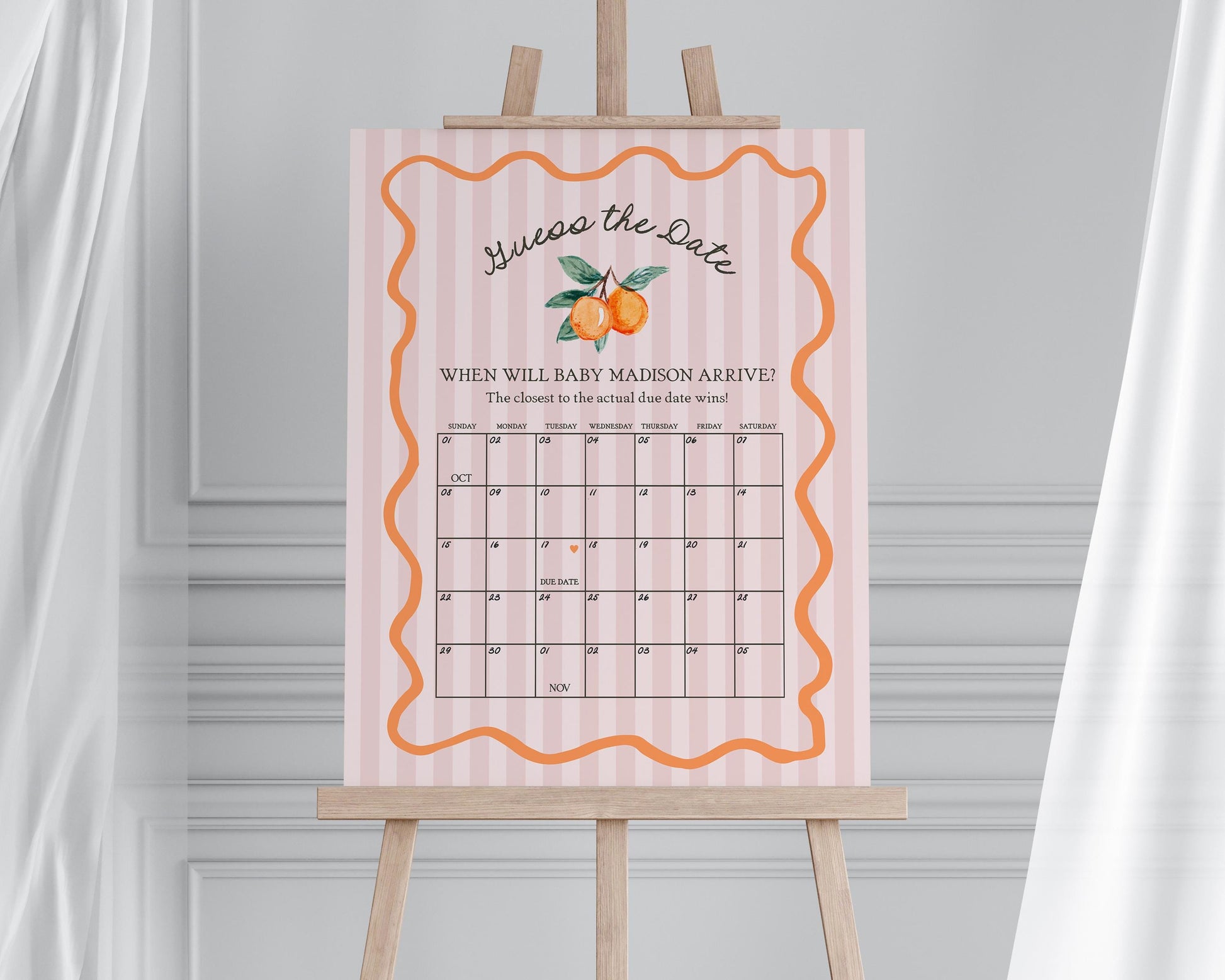 Pink Little Cutie Baby Shower Guess the Date Game Template, Pastel Citrus Baby Sprinkle for Summer Baby Shower, Retro Clementine WP1050